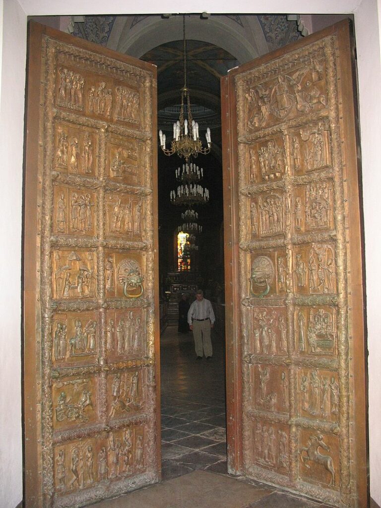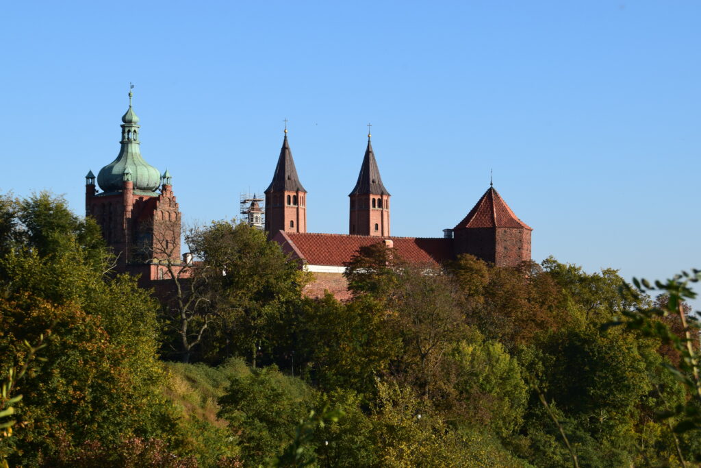 Bogiem, a prawdą, wizualne zdystansowanie katedry płockiej jest marzeniem ściętej głowy. Po pierwsze, jest to jedna z największych świątyń wczesnośredniowiecznych w Polsce. Po wtóre, zlokalizowana jest na Wzgórzu Tumskim, które do jej strzelistości dodaje dodatkowe, bez mała 50 metrów wysokości. W końcu, katedra stanowi jeden kompleks z zamkiem książąt mazowieckich. Pod względem funkcjonalnym, już od końca XV wieku najwyższa wieża zamkowa pełniła funkcję katedralnej dzwonnicy, a większość obiektu zaczęła pełnić funkcje sakralne, jako opactwo benedyktynów, w 1538 roku. Katedra i zamek wznoszą się tak blisko siebie, że widziane nawet z nieznacznego oddalenia zlewają się w jeden, imponujący czerwonocegły kompleks, najeżony dwoma gotyckimi wieżami katedry, wieżą Szlachecką zamku w tym samym stylu, renesansową kopułą nad skrzyżowaniem nawy głównej i transeptu katedry oraz wieżą Zegarową zamku zwieńczoną przysadzistym barokowym hełmem. O wyposażeniu katedry możnaby napisać osobną rozprawkę. Wspomnę tu tylko o drzwiach zamówionych w XII wieku u magdeburskich ludwisarzy. Te, które widzimy wchodząc obecnie do katedry, są wykonaną przed 40 laty kopią. Oryginał znajduje się w cerkwi św. Sofii w Nowogrodzie Wielkim i istnieje multum teorii w jaki sposób i kiedy dokładnie tam trafił. Nie trzeba dodawać, że teorie polskie i rosyjskie znacząco się rozmijają, a jeszcze odmienną teorię mają badacze niemieccy, bo wszak jako przedstawiciele kraju pochodzenia drzwi, powinni wiedzieć swoje. Pod północną wieżą katedry znajduje się kaplica zwana Królewską, gdzie w marmurowym czarnym sarkofagu pochowano znalezione w 1825 roku szczątki licznych książąt mazowieckich oraz Władysława Hermana i jego syna, Bolesława Krzywoustego. Tym samym Płock jest kolejnym, obok Gniezna, Krakowa i Warszawy, miejscem pochówku władców Polski. Nie wiadomo tylko czemu w nazwie kaplicy jest określenie Królewska choć żaden z tych władców nie był koronowany na króla. Najlepiej świadczy o tym znajdujący się na szczycie sarkofagu herb książęcy – alabastrowy orzeł, pozbawiony prawa noszenia korony na głowie.