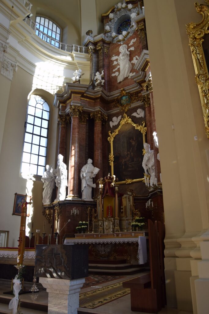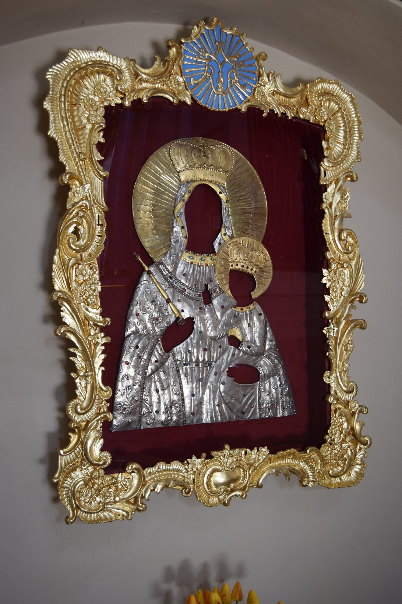 Barokowy kościół już z daleka zapraszał nas szeroko rozwartymi połaciami drzwi, w prześwicie których widać było ołtarz główny. Święta ikona nie jest oryginałem, bo wywieziony w głąb Rosji zaginął on w szaleństwach bolszewickiej rewolucji, lecz wierną kopią z 1929 roku. Ulokowano ją w ołtarzu na jednym z filarów oddzielających nawę główną od bocznej. Nie znalazłem wiele informacji o wyposażeniu wnętrza świątyni. Ot poprawny artystycznie barok i rokoko, nie nadmiernie rozszalały – wszak to nie Dolny Śląsk – ale jak na pn-wsch. Polskę, całkiem bogaty. Ciekawostkę stanowi srebrna sukienka zdobiąca niegdyś ikonę, oprawiona w ramy i powieszona na ścianie lewej nawy. Inną, acz na co dzień niedostępną, jest istniejąca pod kościołem krypta fundatorów: Szczęsnego i Eufrozyny Tyszkiewiczów. W otoczeniu kościoła wznosi się kilka ciekawych i schludnie utrzymanych obiektów takich, jak szkoła, dawna plebania, cerkiew zimowa (tak, tak! przed wynalezieniem centralnego ogrzewania życie, także religijne, w zimie przenosiło się do mniejszych, łatwiejszych do ogrzania pomieszczeń), klasztor prawosławny mieszczący dzisiaj internat, oryginalny klasztor podominikański czy, jakby żywcem przeniesiony z Rosji, drewniany dom gościnny – ze względu na kolor zwany zielonym. Za PRL-u w większości z nich funkcjonowała szkoła rolnicza. W tym okresie powstało też kilka budynków mieszkalnych i warsztatowych. Trochę obawiałem się, w jakim są stanie, ale wszystko jest zadbane i jakimś cudem, mimo tak różnej historii i genezy, tworzy harmonijną całość.