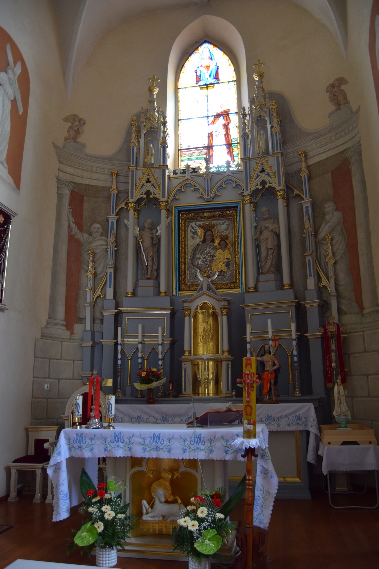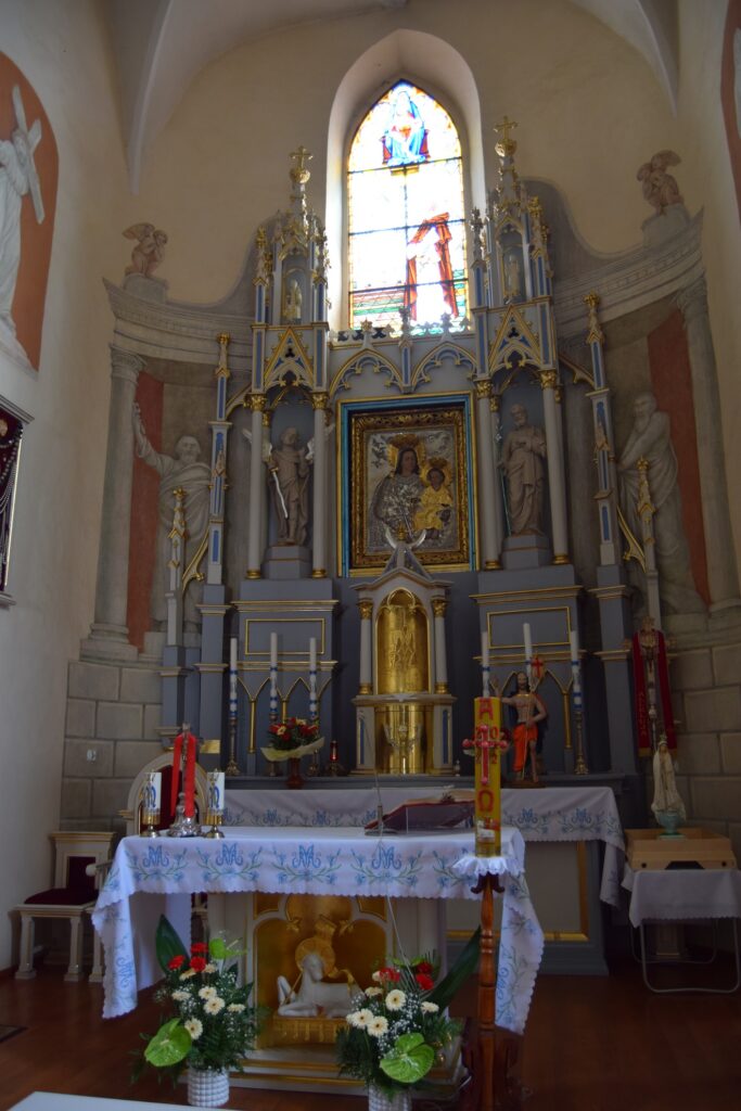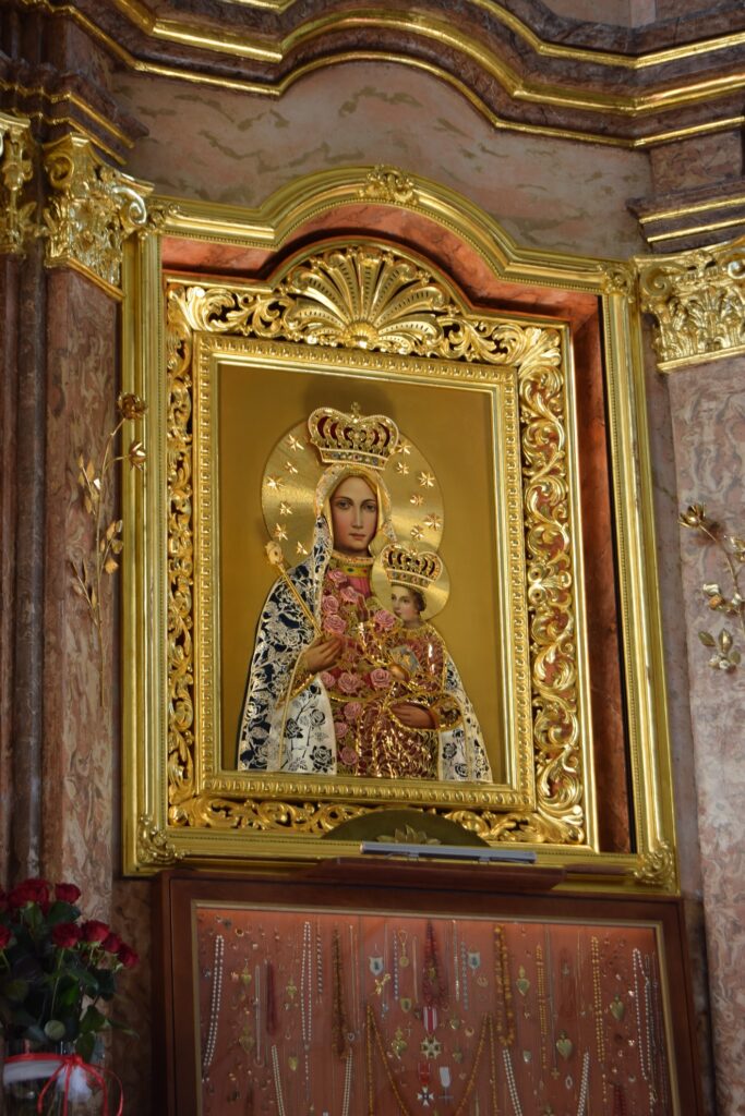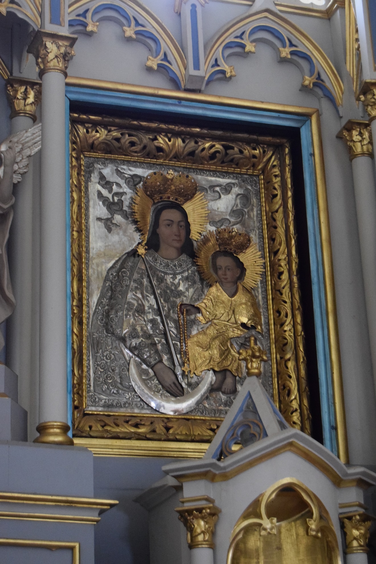 We wnętrzu kościoła, w głównym ołtarzu, znajduje się cudowny obraz Matki Boskiej Różańcowej z XVII w., pokryty srebrną i złotą szatą. Wyposażenie w przeważającej części jest dziełem lokalnych twórców, z nutą chwytającego za serce prymitywizmu. Nas zachwycił naturalnej wielkości anioł z puszką na datki i Bóg Ojciec dynamicznie polatujący nad krucyfiksem.