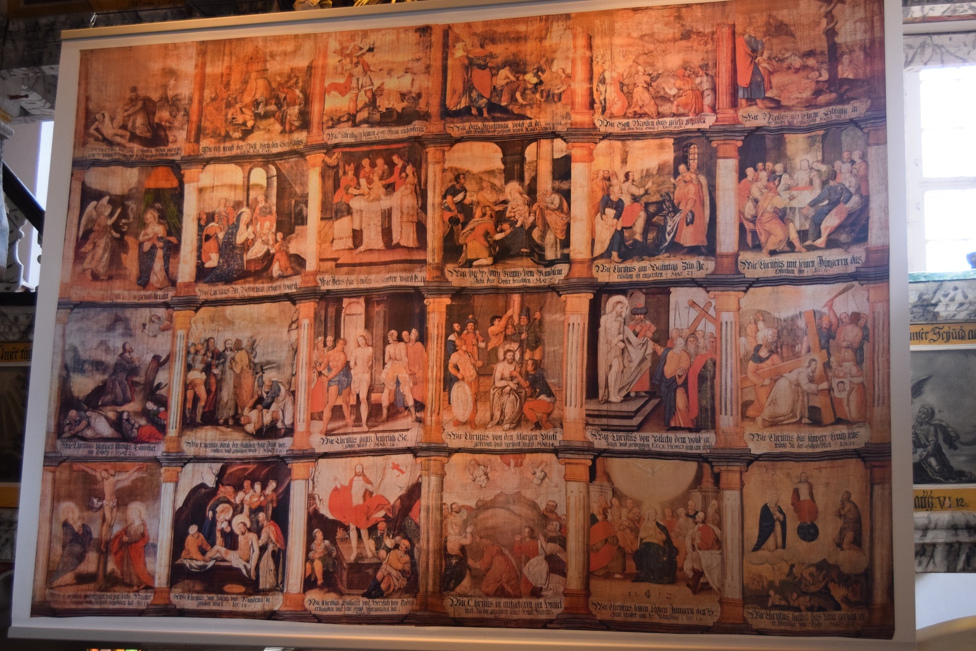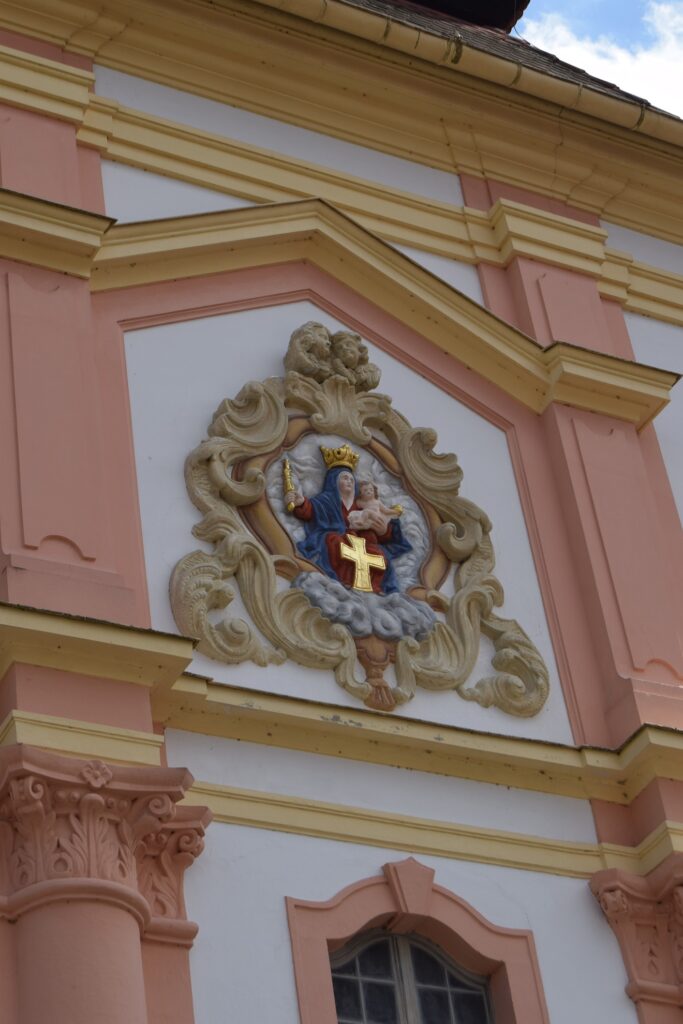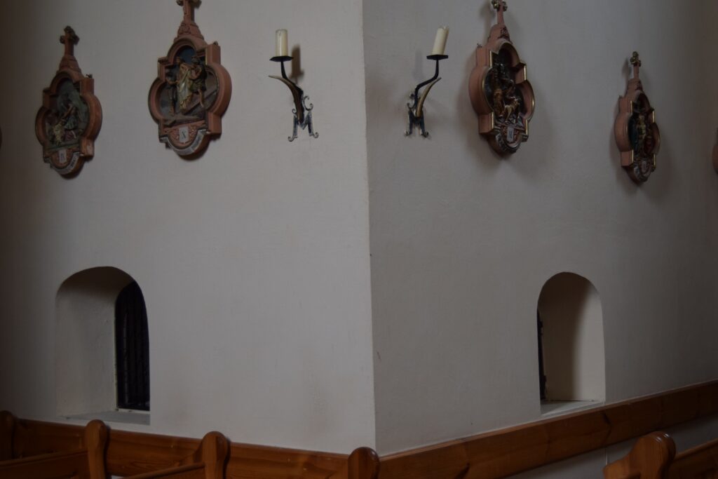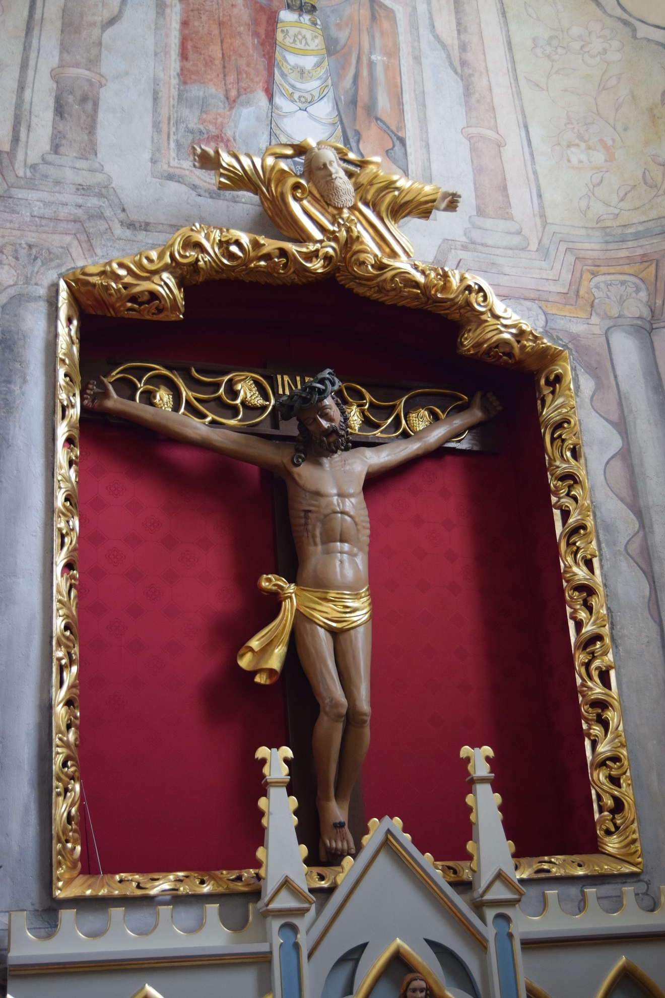 We wnętrzu kościoła, w głównym ołtarzu, znajduje się cudowny obraz Matki Boskiej Różańcowej z XVII w., pokryty srebrną i złotą szatą. Wyposażenie w przeważającej części jest dziełem lokalnych twórców, z nutą chwytającego za serce prymitywizmu. Nas zachwycił naturalnej wielkości anioł z puszką na datki i Bóg Ojciec dynamicznie polatujący nad krucyfiksem.