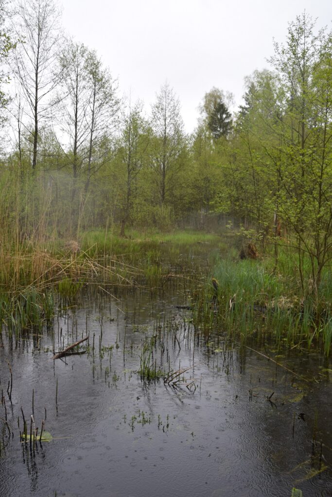 Basen Górnej Biebrzy w swej najbardziej ku północy wysuniętej części płynnie przechodzi w sandrową równinę pokrytą lasami Puszczy Augustowskiej. W 1982 roku przeszedłem ten teren od stacji PKP Jastrzębna aż do Rygola u połączenia Czarnej Hańczy z Kanałem Augustowskim. Po drodze, na uroczysku Kozi Rynek odwiedziłem mogiłę i pomnik ku czci powstańców styczniowych. Teraz chciałem pokazać to ciekawe miejsce reszcie ekipy. Wędrując w strugach deszczu przez bory poprzecinane pasami mokradeł i olsów, dotarliśmy jednak do szlabanu z napisem “Przejścia nie ma”. Wedle mapy, do mogiły zostało nam może 500 metrów. Cóż, Lasy Państwowe nigdy nie były championami w trudnej sztuce komunikacji, ale żeby zamykać bez słowa wytłumaczenia drogę do miejsca pamięci narodowej, to trzeba mieć tupet! W zamian, bez przeszkód zobaczyliśmy standardowy pomnik ku czci partyzantów z okresu II Wojny Światowej. Gdyby nie padało, może zlekceważyli byśmy zakaz, ale w tych warunkach pogodowych ambicja w nas spadła do poziomu bliskiego zeru i zrejterowaliśmy w suche zacisze naszej kwatery.