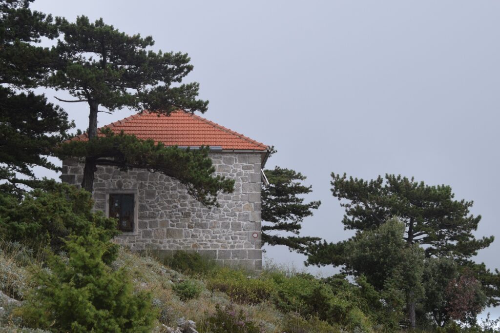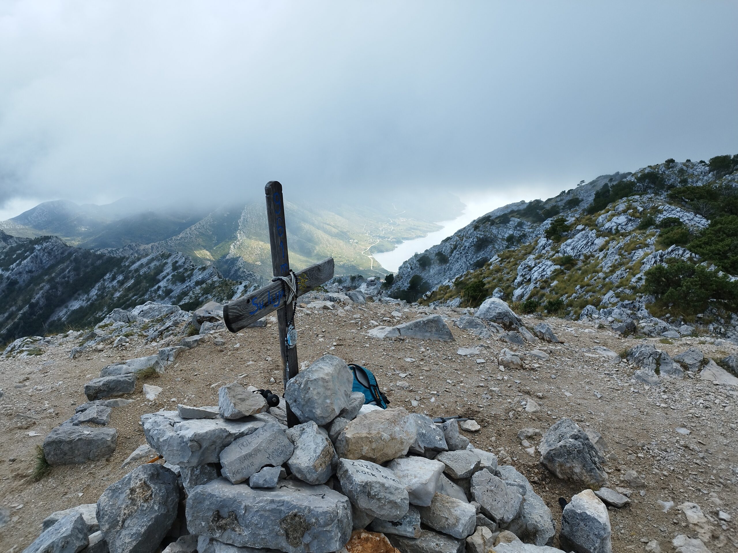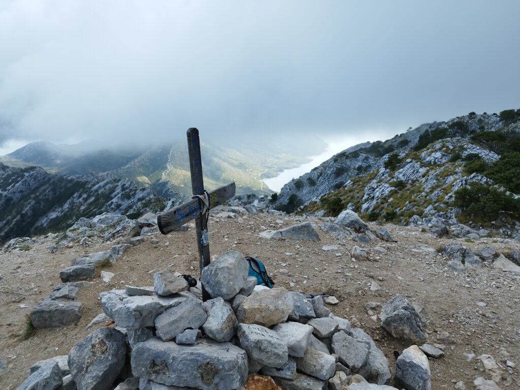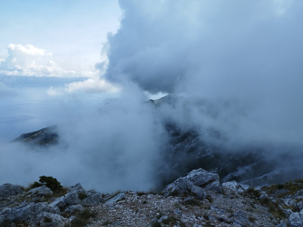 Podejście na szczytowe spiętrzenie Świętego Ilji wiedzie skalistym zboczem poprzerastanym pasmami roślinności zielnej i – z rzadka – większymi krzewami, czy drzewami. Ku południowi, ponad rozległą kotlinką, otwierał się widok na skąpaną w słońcu Korculę. Od północnego wschodu, gdzie grzbiet opadał stromszymi stokami, wiało jednak chłodem. W dolince poniżej kłębiły się chmury z wolna przelewające się na naszą stronę grzbietu. Gdy dotarliśmy na oznaczony kopczykiem kamieni i niewielkim drewnianym krzyżem szczyt, ogarnęły i nas. Przypomniało mi się, jak często z kąpiącego się w promieniach słońca Orebica obserwowałem szczyt Świętego Ilji ukryty pod czapą obłoków, a czasem też spoza jego urwistych południowych zboczy słychać było odgłosy gromów. To samo wspomnienie musiało dręczyć Podziomka, gdyż stanowczo odmówiła przejścia dodatkowych 100 metrów do punktu widokowego na skraju południowego urwiska. Tym razem jednak Ilja Gromownik, który na terenach z wcześniejszymi wpływami kultury helleńskiej przejął rolę i atrybuty pogańskiego Zeusa, był dla nas łaskawy. Chmurzyska dotarłszy do szczytu wyraźnie wytraciły impet. Najpierw podzieliły się na kilka strumieni, a potem niepostrzeżenie wzniosły jeszcze wyżej i rozproszyły. Zanim do tego doszło, w przerwach między chmurami udało mi się wykonać kilka nastrojowo-dramatycznych zdjęć. Gdy ruszyliśmy w drogę powrotną, znowu przyświecało nam słońce.