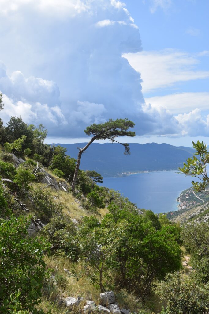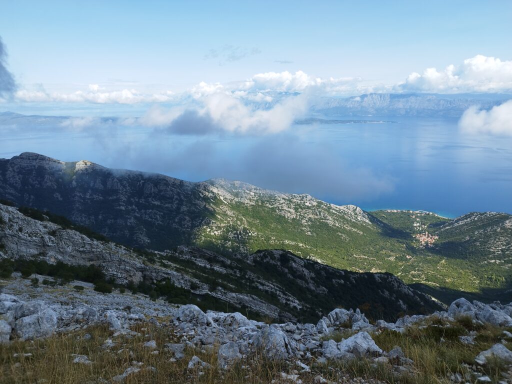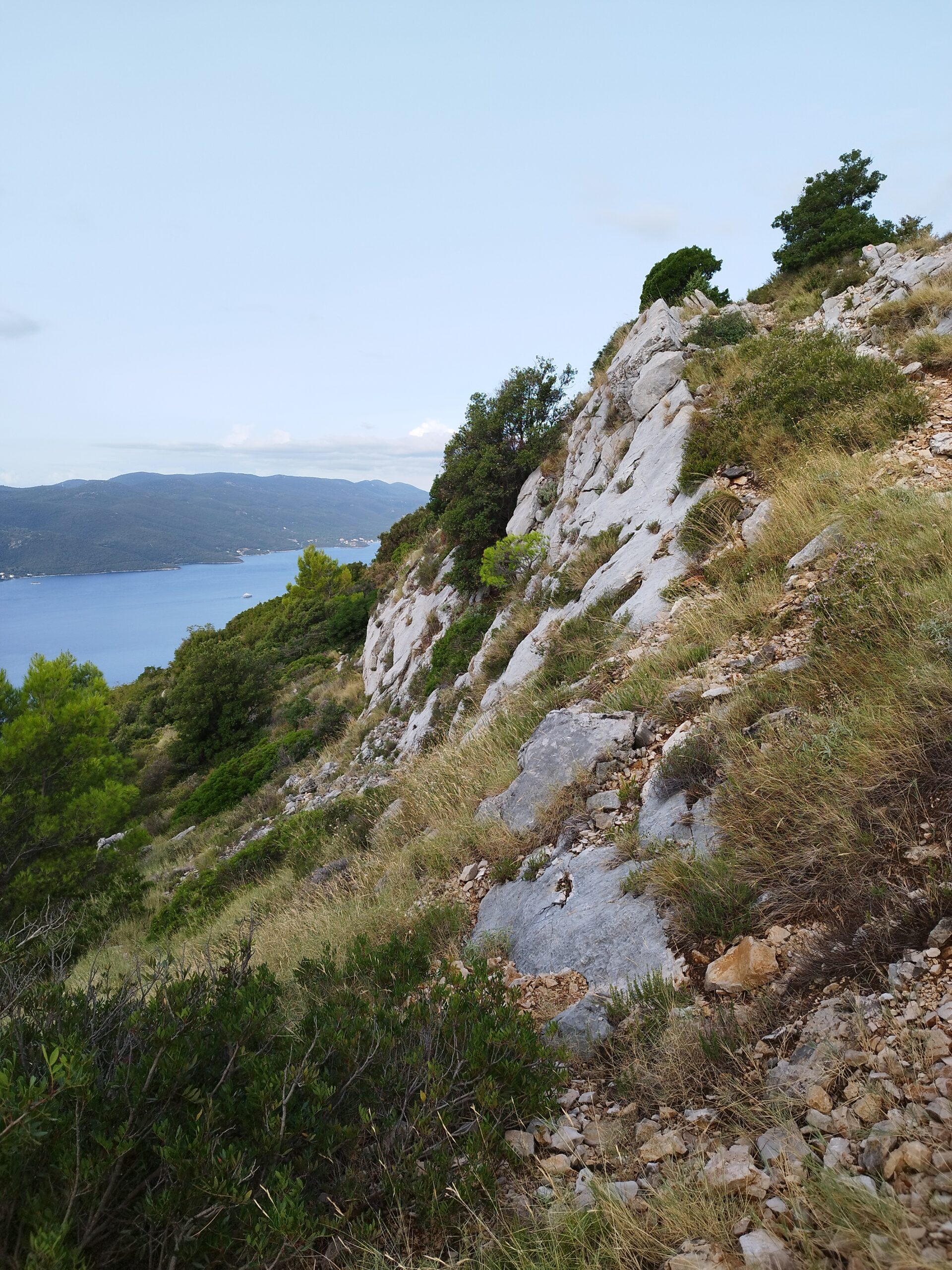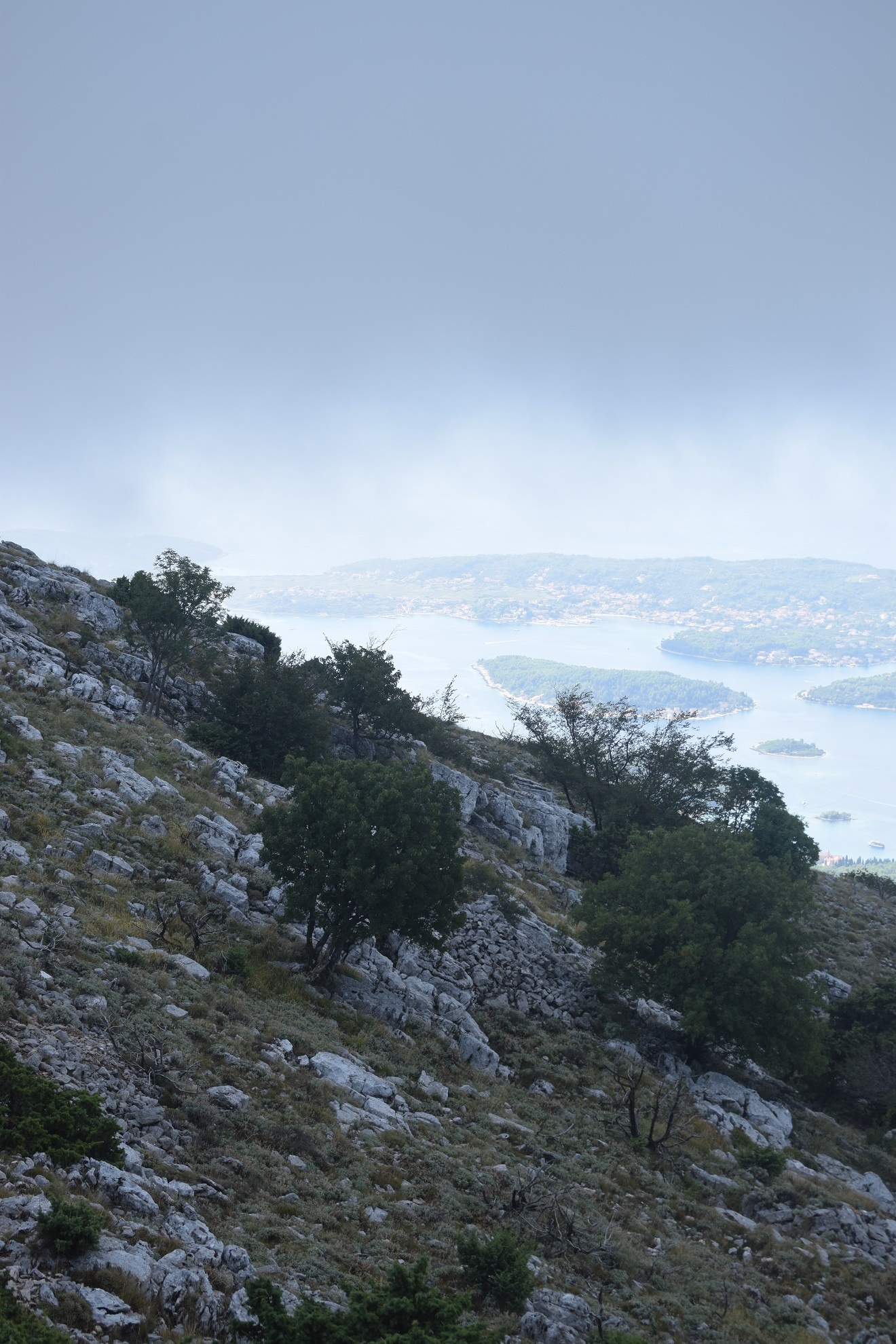 Wędrowcy będący pod wrażeniem surowości zboczy opadających ku Orebicowi mogą zostać zaskoczeni bujnością i rozmaitością szaty roślinnej i krajobrazu na szlaku. Mnie urzekł zwłaszcza trawers zboczy suchej doliny opadającej ku miejscowości Kuciste. Rosnące tam sosny o parasolowatej formie wynoszą się ponad krzaczaste zarośla makii. Rozległe wypłaszczenie, przy którym schodzą się szlaki z Orebica i Viganj, porasta natomiast gęsty, wysokopienny las podobny do tych, które widziałem w niższych partiach rumuńskich Karpat. W opisach podejścia na Świętego Ilję często wspominane są spotkania z końmi pasącymi się tu bez nadzoru człowieka. My nie mieliśmy tego szczęścia, natknęliśmy się tylko na odchody, które równie dobrze mogły być owcze, jak i muflonie, gdyż ten gatunek zamieszkuje górzyste wnętrze półwyspu. Największymi napotkanymi zwierzętami pozostały więc psy, które dość często towarzyszyły, ku uciesze Harrego, dwunożnym zdobywcom szczytu. W miarę pokonywania kolejnych poziomic, otwierały się przed nami coraz dalsze widoki. Początkowo tylko na Korculę, następnie także na dalej położone Lastovo i Mljet. Spod szczytu ku północy widać było położoną malowniczo u wylotu wąskiej doliny wioseczkę Duba Peljeśka, a za Neretvianskim Kanałem – wschodnią końcówkę Hvaru i kontynentalną Dalmację. Bardzo ciekawy był też skalisty grzebień ciągnący się od szczytu, ku wschodowi.