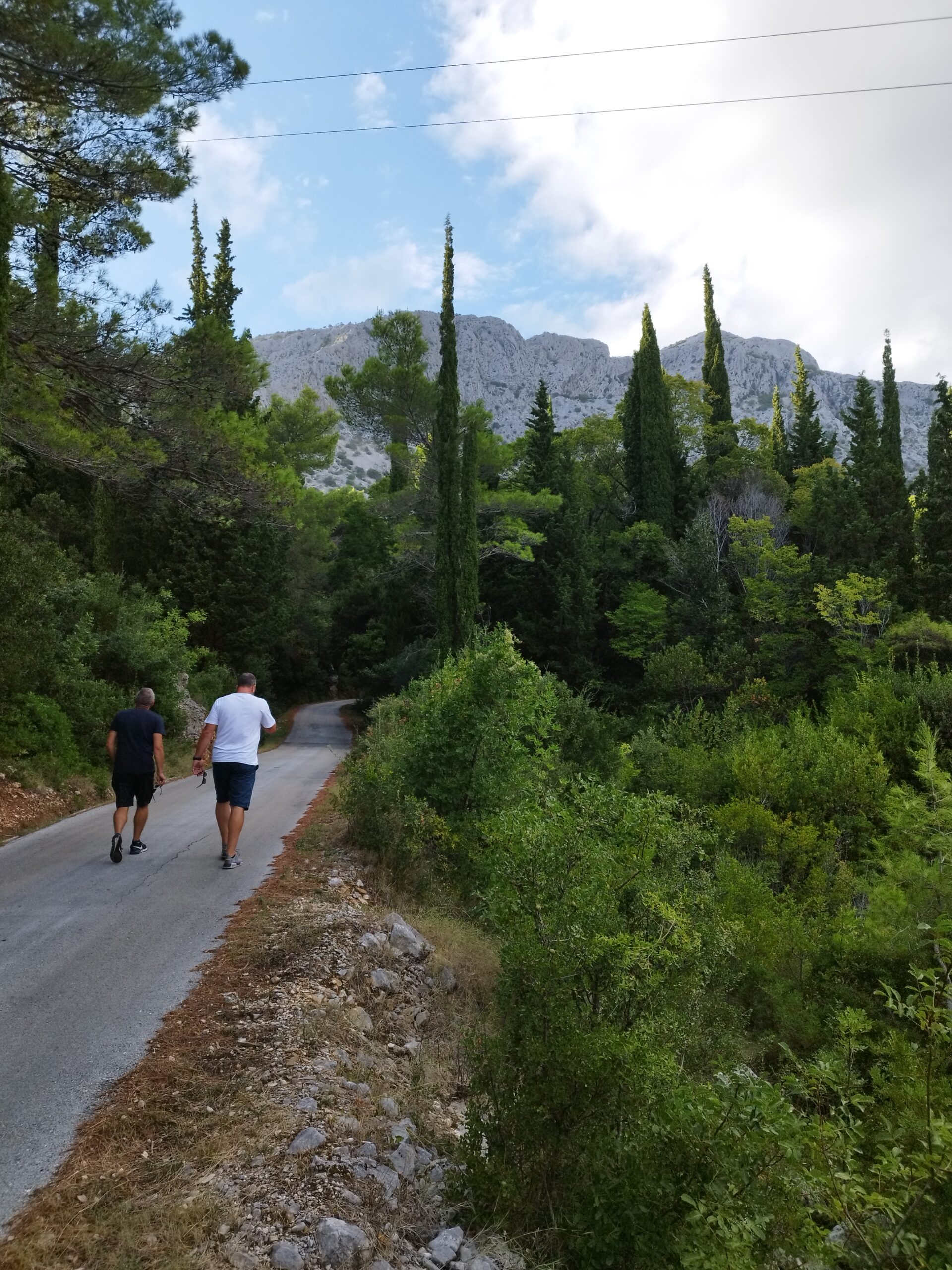 Pogoda nam sprzyjała. Po tygodniach męczących, sięgających blisko 40 C upałów, przeszedł front atmosferyczny niosący opady i  temperatury o ponad 10 C niższe. Mimo to, postanowiliśmy wyruszyć ze wschodem słońca i zaopatrzeni w odpowiednie zapasy wody. Po drodze nie ma żadnych źródeł, ani strumieni, lecz ostatnie deszcze zostawiły po sobie sporo kałuż, z których skwapliwie korzystał Harry – czworonożny turysta górski. Jedynym zastosowanym przez nas ułatwieniem było pokonanie pierwszych 150 metrów przewyższenia samochodem, który zostawiliśmy na parkingu przy klasztorze franciszkańskim, górującym nad miasteczkiem. Sumienie mieliśmy czyste, gdyż już wcześniej odwiedziliśmy go na piechotę. Pierwszy kilometr trasy biegnie jeszcze po asfalcie, potem skręca się na kamienistą ścieżkę dźwigającą się szparko w górę po południowych zboczach masywu. Ekspozycja nie jest nadmierna, więc nawet osoby z umiarkowanym lękiem przestrzeni nie powinny mieć problemu. W niektórych miejscach ścieżka jest na tyle wąska, że w przypadku mijanki trzeba użyć wyobraźni i zasad górskiego savoir-vivre. Przy wczesnym wymarszu prawdopodobieństwo spotkania turystów schodzących w dół jest jednak minimalne. W przeciwieństwie do polskich, miejscowe kierunkowskazy wskazują bardzo krótki czas przejścia danego odcinka. Dość powiedzieć, że nam wejście zajęło 4 godziny, a zejście 3, podczas gdy sugerowany czas wejścia, to 2 godziny i 50 minut. Po prawdzie, przy podejściu zostaliśmy wyprzedzeni przez kilka osób, podczas gdy my nie wyprzedziliśmy nikogo. Ale też mało kto zatrzymywał się na odpoczynek przy “Planinarskim domu”, choć to miłe, widokowe miejsce na skraju lasu i skalnych połonin. Może gdyby domek był otwarty, byłoby więcej chętnych do postoju.