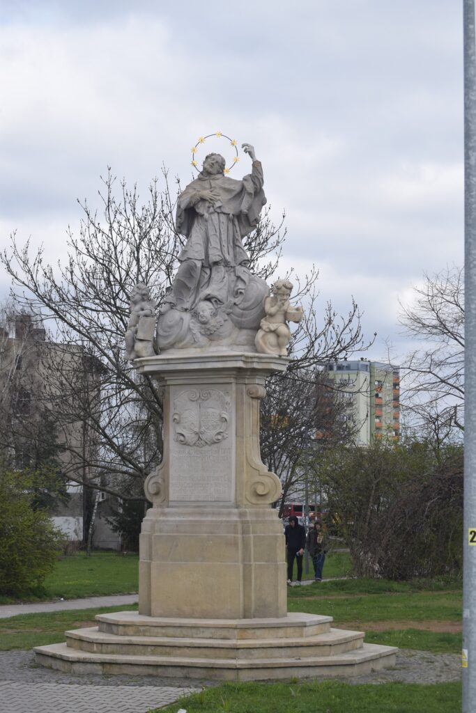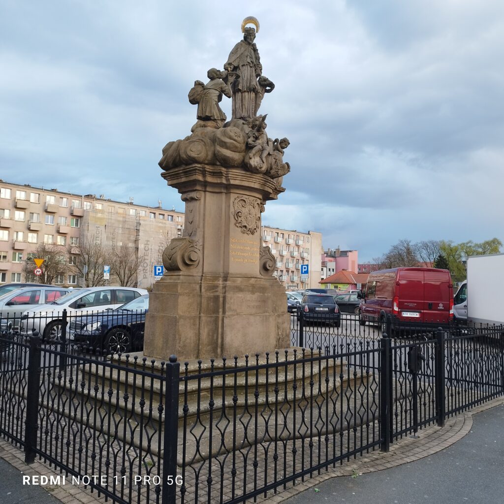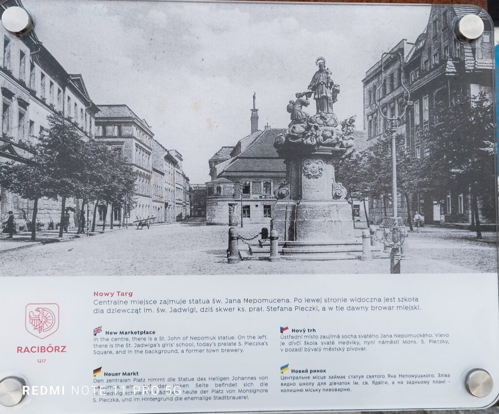 Staromiejska statua św. Jana Nepomucena w Raciborzu wykonana jest w wersji bogatej. Wyniesiona na szczyt zdobionego wolutami postumentu otoczona jest puttami wyłaniającymi się z obłych zawijasów, ni to chmur, ni fal Wełtawy. Chyba dla zrównoważenia kompozycji, bo nigdy nie słyszałem o takim atrybucie Nepomuka, u stóp świętego klęczy żebrak otrzymujący jałmużnę. Choć kompozycja rzeźbiarska musiała powstać w schyłkowym okresie panowania austriackiego nad Śląskiem (lata 20- do 40-tych XVIII w.), to w obecne miejsce trafiła z inicjatywy imiennika świętego, proboszcza pobliskiego kościoła Wniebowzięcia Najświętszej Marii Panny, dopiero w roku 1818 i odtąd, przez 127 lat, stanowiła ozdobę Nowego Rynku. Nie ma wątpliwości, że fundatorzy nie poskąpili środków i najęli do prac utalentowanego rzeźbiarza. Prawdopodobnie był to sam Johann Melchior Oesterreich, tajemniczego pochodzenia (nie dajmy się zwieść nazwisku) artysta, autor kolumny maryjnej na raciborskim rynku, jak też mnogich Nepomuków rozsianych po Opolszczyźnie i Górnym Śląsku.