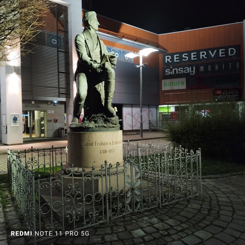 Nie jest to jedyne miejsce w Raciborzu, gdzie boleśnie odczuwa się dysonans między małą architekturą, a jej otoczeniem. Wychodząc do miasta z dworca kolejowego, znajdziemy się na trójkątnym placyku, z którego szczytu wybiega w stroną centrum reprezentacyjna niegdyś ulica Kolejowa (Bahnhofstrasse), obecnie nosząca imię Mickiewicza. Można nią dotrzeć na raciborski rynek, a jej perspektywę zamyka wieża kościoła Wniebowzięcia Najświętszej Marii Panny. Włodarze miasta postanowili jednak wesprzeć lokalną przedsiębiorczość i, za ich zgodą, u początku miłej dla oka osi widokowej umiejscowiono plastikową budkę z kebabem. Podążając ulicą Mickiewicza w stronę centrum dotrzemy do pomnika Josepha von Eichendorffa, niemieckiego poety romantycznego, który urodził się i lata dzieciństwa spędził w Raciborzu i jego okolicach. Pomnik jest kopią wcześniejszego monumentu z 1909 roku. Pierwotnie za tło miał gmach starostwa powiatowego. Zarówno budynek, jak i pomnik, zostały starte z powierzchni ziemi “w wyniku” powrotu ziemi raciborskiej do Macierzy. Ponowne odsłonięcie pomnika nastąpiło w roku 1994, w pierwotnej lokalizacji. A po 14 latach zdecydowano, że najlepszym tłem dla niego będzie galeria handlowa. Tym sposobem poeta znany w Niemczech, jako “piewca lasów”, został zdegradowany do roli odźwiernego w świątyni komercji. Że nie jest to w Polsce wyjątek świadczy, opisany w jednym z wcześniejszych postów, przypadek pomnika Józefa Wybickiego w Kościerzynie.