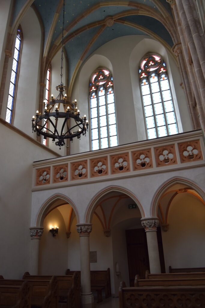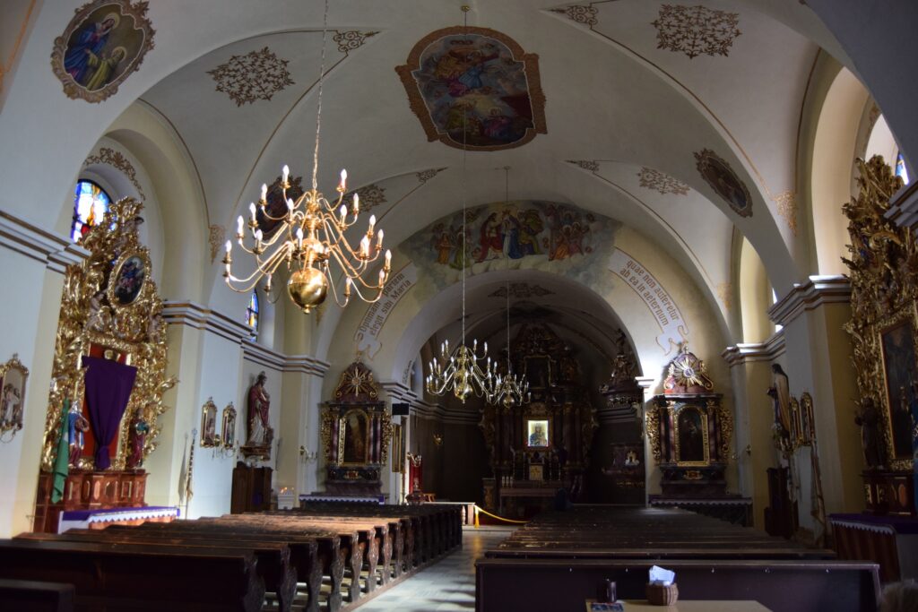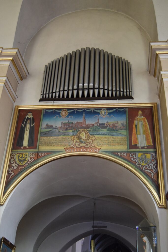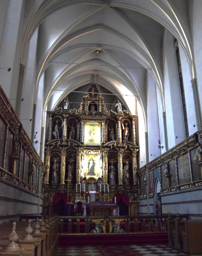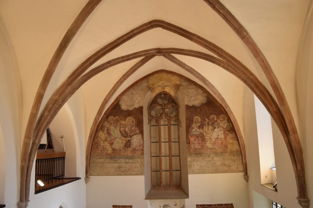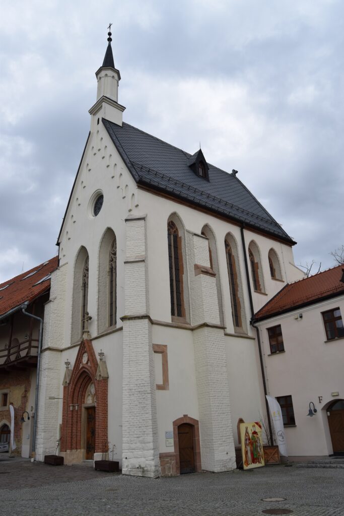 Wnętrze drugiego z rynkowych kościołów, podominikańskiego, pod wezwaniem św. Jakuba, uległo chyba jeszcze większym zniszczeniom. Nadal ma barokowe ołtarze boczne i ambonę, ale ołtarz główny, przedstawiający adorację Marii z dzieciątkiem przez anioły, jest całkiem nowy. To on jednak zrobił na mnie największe wrażenie swoją bezpretensjonalnością – umieszczenie figur na gołej ścianie wyeksponowało uroczo całą scenę. Trudno mu jednak przyjrzeć się z bliska, bo, poza porami nabożeństw, kościół pozostaje zamknięty. Ostatni ze staromiejskich kościołów, niegdyś dominikanek, pw. św. Ducha, nie pełni już od 1810 roku funkcji sakralnej, a w 1927 roku zamieniony został na muzeum. Wnętrze podzielono na trzy kondygnacje, dzięki czemu można z bliska podziwiać detale późnorenesansowych polichromii ściennych. Muzeum chlubi się posiadaniem oryginalnej, liczącej sobie ok. 2800 lat, mumii egipskiej wraz z sarkofagiem. Z Egiptu przywiózł ją baron Anzelm von Rothschild i podarował młodej narzeczonej. Ta – co za niespodzianka! – nie przyjęła makabrycznego prezentu, który ostatecznie trafił do muzeum. Mnie jednak najbardziej ujął renesansowy piec zrekonstruowany na podstawie pozostałości znalezionych na zamku, zwłaszcza, że wśród postaci oddanych na jego zielonkawych kaflach poczesne miejsce zajmuje mój patron – św. Krzysztof.