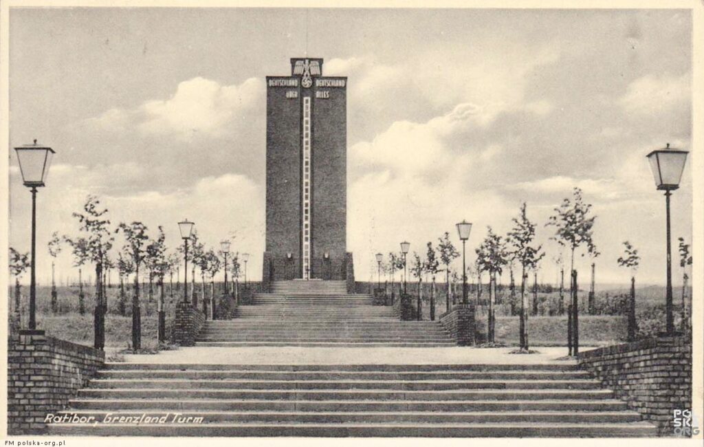 Ku północy natomiast, w odległości nieco ponad kilometra, widać żelbetowej konstrukcji wieżę ciśnień oddaną do użytku w 1936 roku. O ile jej powstanie było uzasadnione rzeczywistymi problemami miasta z zaopatrzeniem w wodę, o tyle forma, którą przybrała oraz sposób użytkowania, starały się sprostać potrzebom ideowym rządzącej już wówczas niepodzielnie NSDAP. Konstrukcja o wysokości 37 metrów była doskonale widoczna z polskiego brzegu Odry, dlatego na jej szczycie zainstalowano maszt flagowy, godło państwowe oraz pierwsze wiersze niemieckiego hymnu narodowego. W przyziemiu  natomiast ulokowano mauzoleum bojowników o nazistowkie Niemcy, a na kolejnych kondygnacjach, ośrodek szkoleniowy NSDAP. Całości nadano nazwę Wieży Nadgranicznej (Grenzlandturm). Obiekt, choć imponujący rozmachem, nie spełnił założonej roli, gdyż wytwarzał zbyt wysokie ciśnienie wody, jak na wytrzymałość mającej już swoje lata raciborskiej sieci wodociągowej. Może, gdyby o jego parametrach decydowali inżynierowie, a nie politycy, byłby bardziej przydatny dla miasta.
