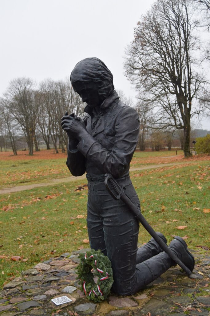 Wkrótce dotarliśmy do Kopciowa. Na pustawym placu wznosi się tam nieproporcjonalnie mały pomniczek Emilii Plater. Ku naszemu zaskoczeniu, sama figura odzianej z męska bohaterki została pomalowana na różowo, choć jak nam się zdawało, na starszych fotografiach była złota. No, ale na tych samych fotografiach, na placu zasiana była trawa i rosły drzewa, po których teraz nie zostało ani śladu. Piękne stare drzewa rosną za to na cmentarzu, gdzie pochowano, początkowo pod zmienionym nazwiskiem, bohaterkę zmarłą z wyczerpania od wędrówki i ukrywania się po lasach. Cmentarz nie pełni już funkcji grzebalnych. Zachowało się na nim tylko parę nagrobków, wykonanych z najbardziej trwałych materiałów. Kilka kilometrów na północ od Kopciowa znajdował się dwór Justianowo (Vainežeris), gdzie próbowano, bezskutecznie, ratować zdrowie i życie panny z dobrego domu, która zaniemogła i przebywała w pobliskiej leśniczówce. Po budynkach, zniszczonych przez litewskie podziemie w latach powojennych, nie ma już śladu. Na miejscu dworu stoi jednak drugi, artystycznie bardziej udany, pomnik Emilii Plater. Oryginalny, bo przedstawiający “pułkownika” pod bronią, choć w pozycji klęczącej. Miejsce jest niezwykle urokliwe, z bogatym w starodrzew parkiem, otaczającym niewielkie jezioro. Najbliższe sadyby ludzkie są oddalone o conajmniej pół kilometra, więc nikomu nie przeszkadzało odśpiewanie przez nas chóralnie mickiewiczowskiego poematu.