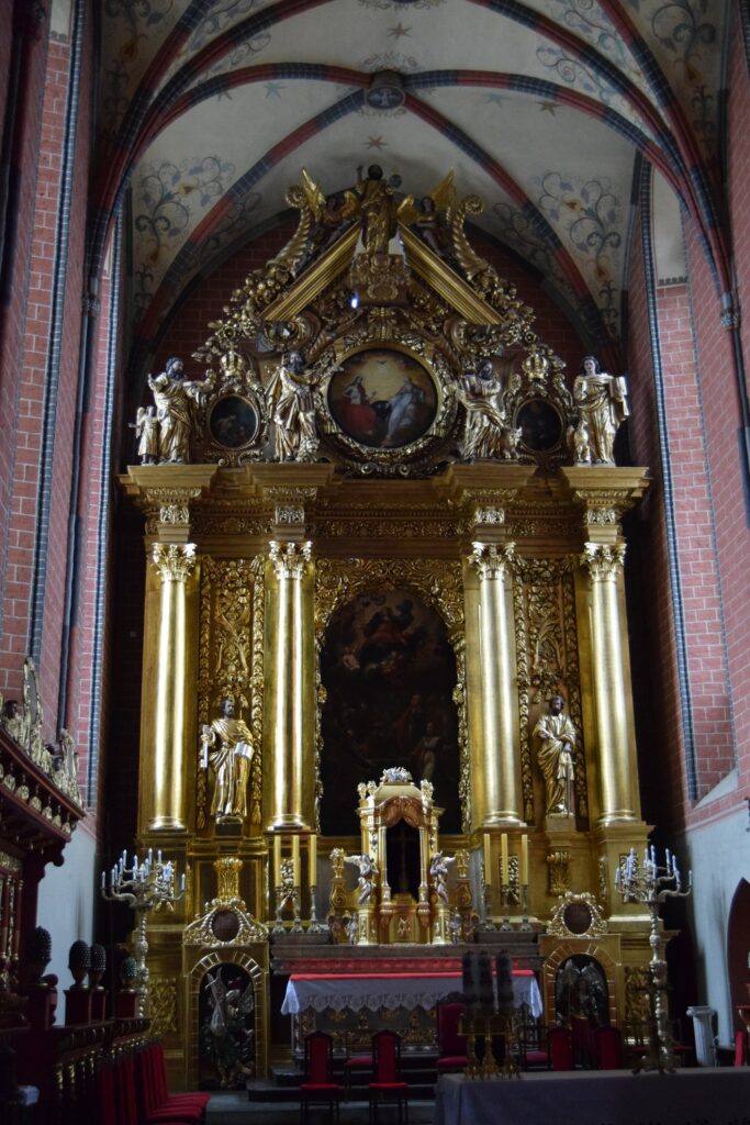 Mnogość budowli sakralnych przy względnie małej liczbie mieszkańców skutkuje też, rzadką w Polsce, rozmaitością formy ich użytkowania. To z kolei rzutuje na ich atrakcyjność turystyczną. Parafia obejmująca całe stare miasto jest tylko jedna z kościołem farnym Wniebowzięcia NMP wznoszącym się w pd.-wsch. narożniku Rynku. Świeżo odnowione wnętrza atakują zwiedzających złoceniami rozbuchanego baroku. Ołtarz z relikwiami św. Walentego jest w tym otoczeniu skromnym elementem wyposażenia. W zamknięciu lewej nawy jest ołtarz z XVII wiecznym obrazem Matki Boskiej Bolesnej (Pieta Chełmińska). Uznana za opiekunkę miasta jest, w różnych formach, oddana i wyeksponowana w przestrzeni miejskiej np. jej rzeźba wita wkraczających do centrum przez Bramę Grudziądzką. Starsze, bo XIV wieczne, są polichromie, które ukazują, i to dwukrotnie, mojego patrona św. Krzysztofa. Ze względu na usytuowanie, bogactwo wyposażenia oraz fakt udostępniania w okresie letnim wieży widokowej, kościół ten jest najpopularniejszy i najbardziej znany wśród turystów. Ja sam, dotychczas, nie odwiedziłem innej chełmińskiej świątyni.