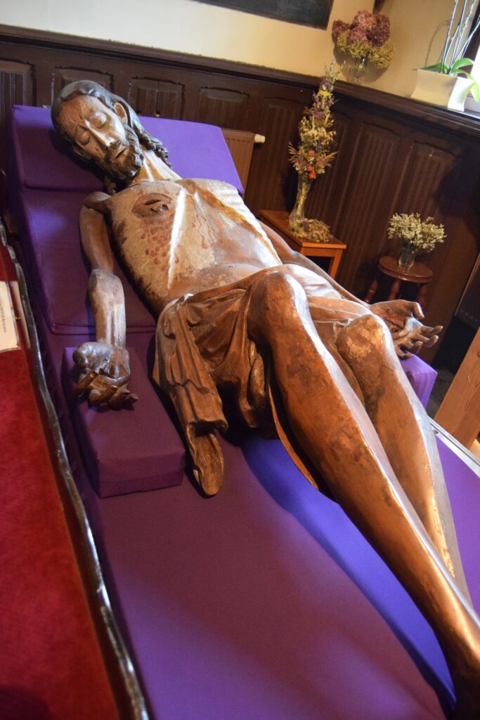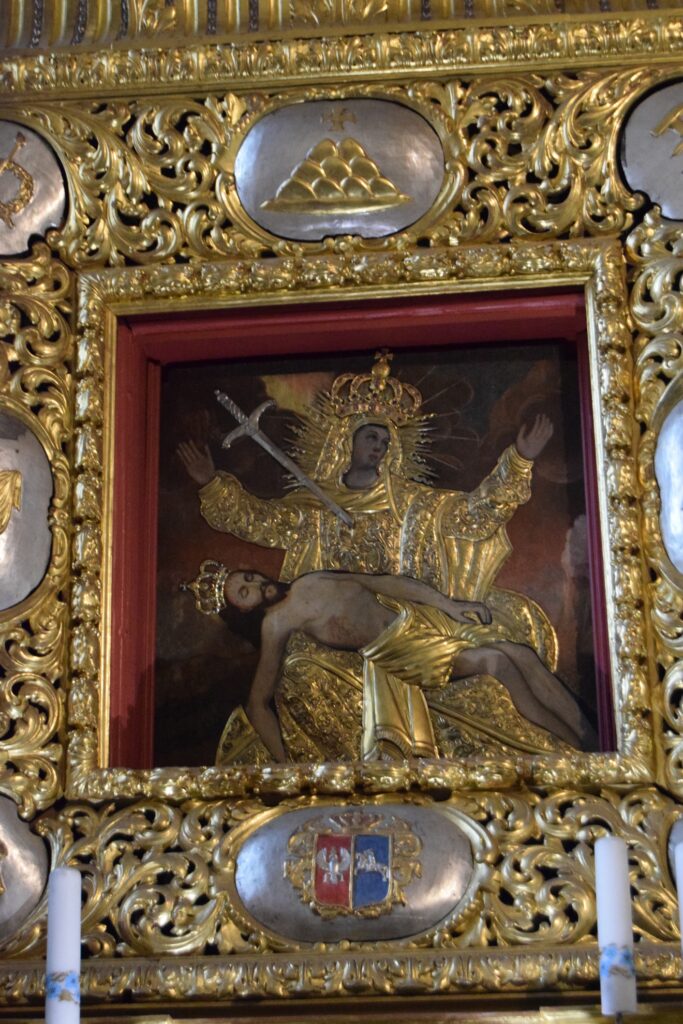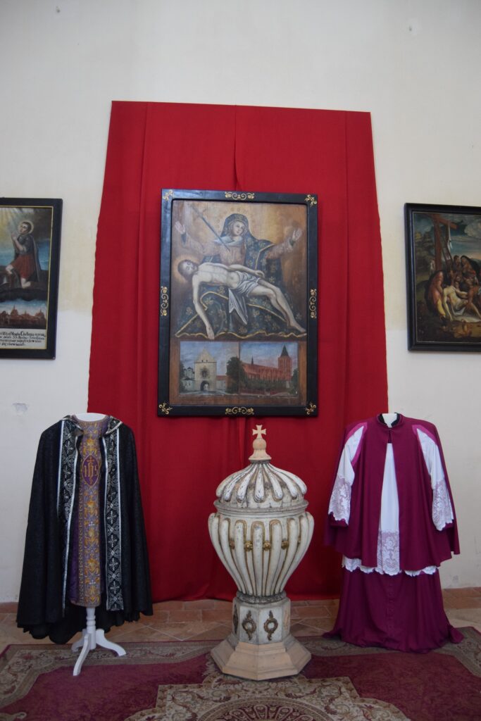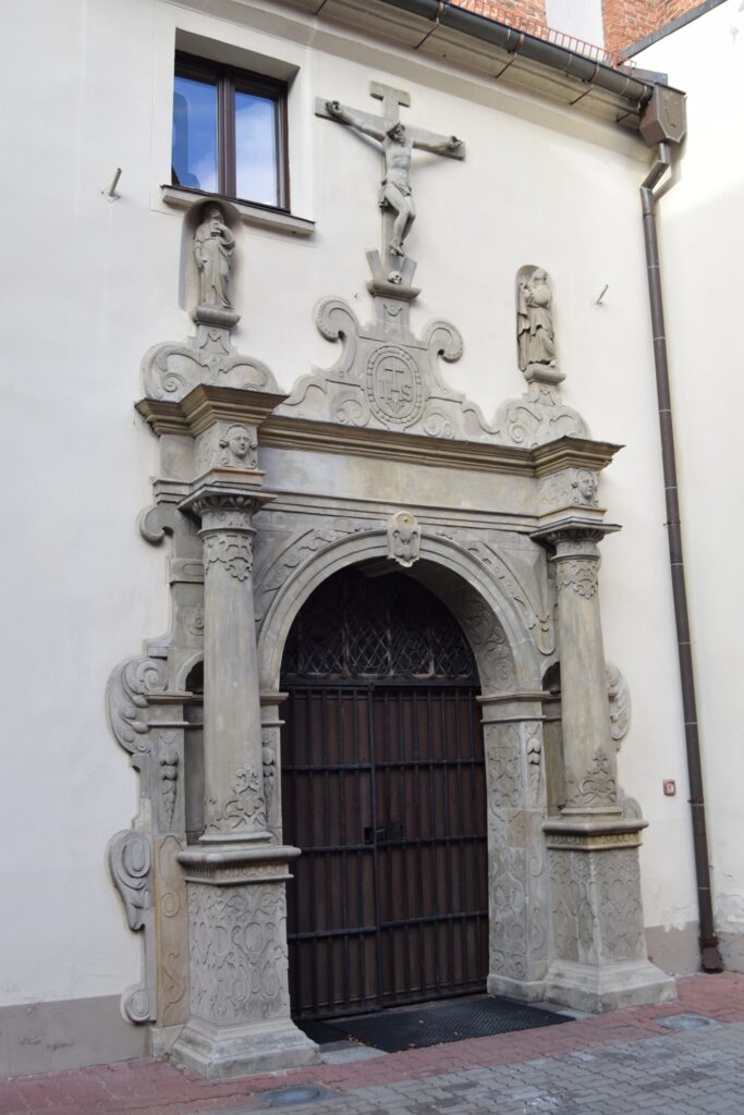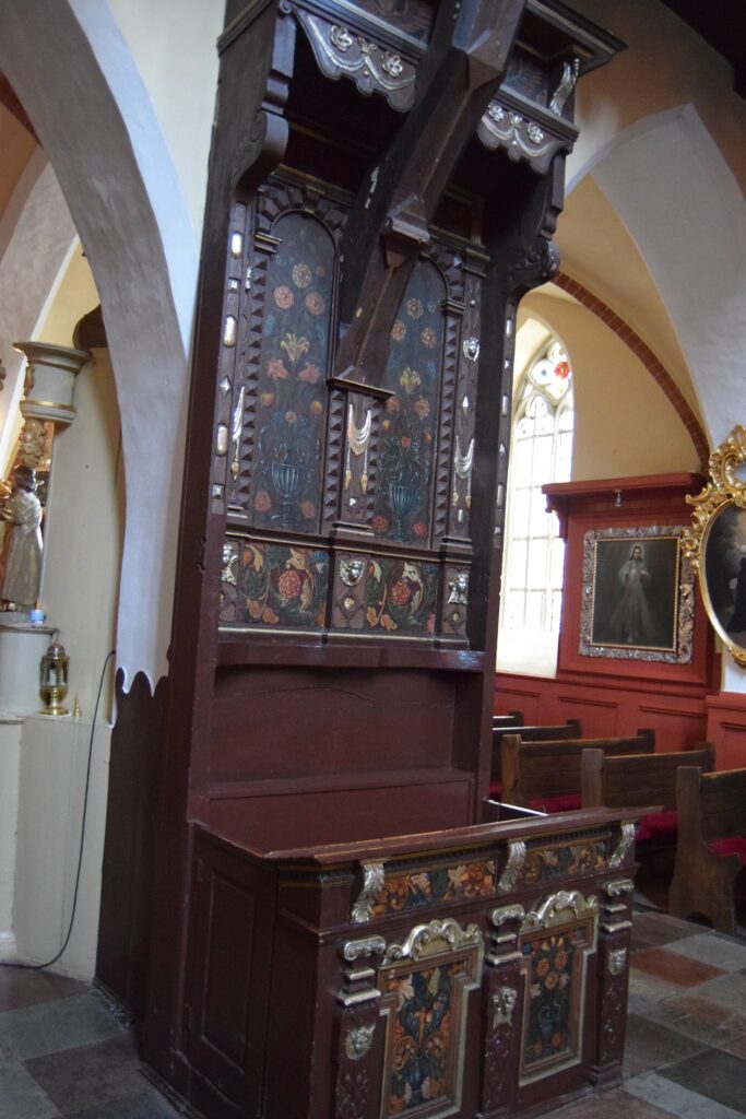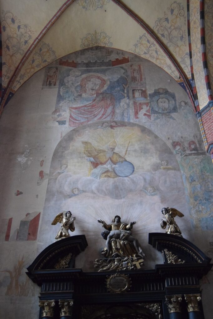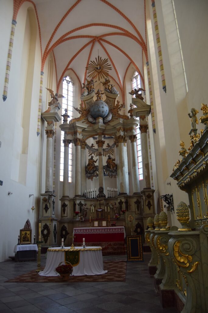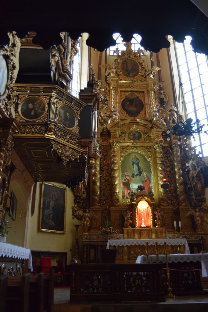Oprócz kościoła farnego najcenniejsze wyposażenia zachowało się w klasztornym kościele sióstr szarytek. Szarytki, prowadzą w Chełmnie duży kompleks zakładów opiekuńczych. Duży w tym przypadku oznacza zajmujący powierzchnię ok. 1/6 starego miasta. Pierwotnie było to bowiem miejsce przewidziane na zamek, nie byle jaki, bo siedzibę Wielkiego Mistrza Zakonu NMP. Gdy plany się zmieniły, Krzyżacy udostępnili teren zakonowi cystersek, od których klasztor przejęły benedyktynki, a w końcu już w XIX w. szarytki. Kościół, przylegający do murów miejskich od ulicy oddzielony jest młodszą zabudową klasztorną. Jest architektonicznym klejnotem dla wtajemniczonych. Aby go zwiedzić trzeba udać się do klasztornej furty. To tradycyjne określenie oznacza wejście głównymi drzwiami i poproszenie o wskazówki siostry dyżurującej w pomieszczeniu, w świeckim świecie, zwanym portiernią. Zanim dostaniemy się do kościoła trzeba obejrzeć kilka pomieszczeń z historycznymi sprzętami i strojami liturgicznymi oraz klasztorną aptekę. Kościół ma wydłużony balkon chóru, skąd mszy słuchają zakonnice, więc cała reszta wyposażenia, w tym organy, upchnięta jest w prezbiterium i bocznych kaplicach. Poza wspaniałym barokowym ołtarzem znajdziemy tam przejmującą XIV wieczną figurę Chrystusa z ruchomymi ramionami umożliwiającymi zdjęcie z krzyża i umieszczanie jej w grobie przed Wielkanocą oraz doskonale zachowaną płytę grobową z końca XIII w. Swój dobry stan zawdzięcza faktowi, że przez wieki była używana jako blat stołu ołtarzowego. Wystrój malarski charakteryzuje użycie jaskrawych motywów kwiatowych oraz śmiałe zestawienia kolorów stwarzające, zwłaszcza w partiach wejściowych, wrażenie pewnej orientalności. Nie wszystkie części zespołu klasztorno-opiekuńczego są dostępne dla zwiedzających. Nam zdarzało się utknąć pod zamkniętymi drzwiami. Jednak bez paniki! Niespodziewanie pojawiała się wtedy postać w habicie, otwierała zamknięte wrota i udzielała rad co do dalszej drogi.