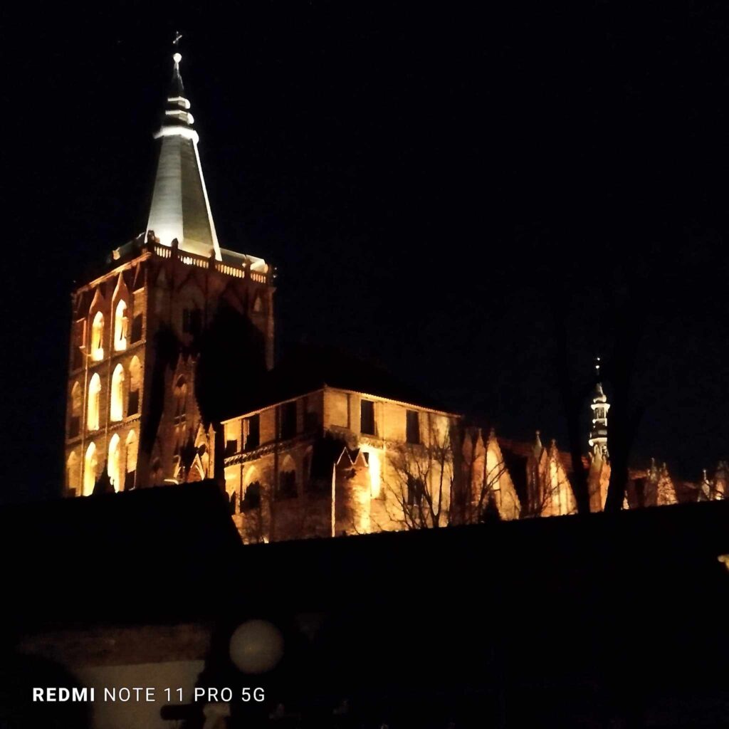 Jednakże, z kilkunastu polskich miast, w których przechowywane są relikwie św.Walentego tylko w Chełmnie postanowiono wykorzystać ten fakt do promocji miasta. Stąd, gdy otworzymy stronę internetową urzędu miasta pierwsze co rzuci się nam w oczy to hasło “Chełmno – miasto zakochanych” oraz logotyp w kształcie serca, obydwa chronione znakiem Ⓡ . W okolicach 14 lutego przygotowywany jest specjalny program walentynkowy, w ramach którego można za darmo zwiedzać miejskie zabytki, uczestniczyć w wystawach, prelekcjach, a nawet nabożeństwach dla zakochanych organizowanych w kościele ojców Pallotynów. Na rynku przez dwa dni odbywa się jarmark św. Walentego, a sklepy przyozdabiają się czerwonymi serduszkami i/lub elementami bielizny damskiej w tymże kolorze. Co jednak najważniejsze – naród ten scenariusz kupuje! Po zasiedleniu pokoju w staromiejskim pensjonacie wybraliśmy się z Podziomkiem na spacer po głównym staromiejskim deptaku – ulicy Grudziądzkiej. Było blisko godziny 20 w piątkowy wieczór, łapał lutowy mrozek, powietrze było ostre jak brzytwa. Ale ulica tętniła życiem, sklepy były otwarte, towarzystwo liczne i ożywione. Na rynku odbywał się jakiś koncert, do którego nagłośnienia użyto pewnie dużą część mocy konsumowanej przez miasto w przeciętny wieczór. Restauracje i kawiarnie puchły od klientów. Rezerwacji stolika, robionej na tydzień przed wyjazdem udało mi się dokonać w trzeciej z kolei, chyba największej w mieście, karczmie. Przy okazji dowiedziałem się, że na św. Walentego lokale wydłużają swoje normalne godziny pracy. A to wszystko w pomorskim, powiatowym miasteczku liczącym niespełna 20 tysięcy mieszkańców. Toż to prawdziwy cud za wstawiennictwem świętego!