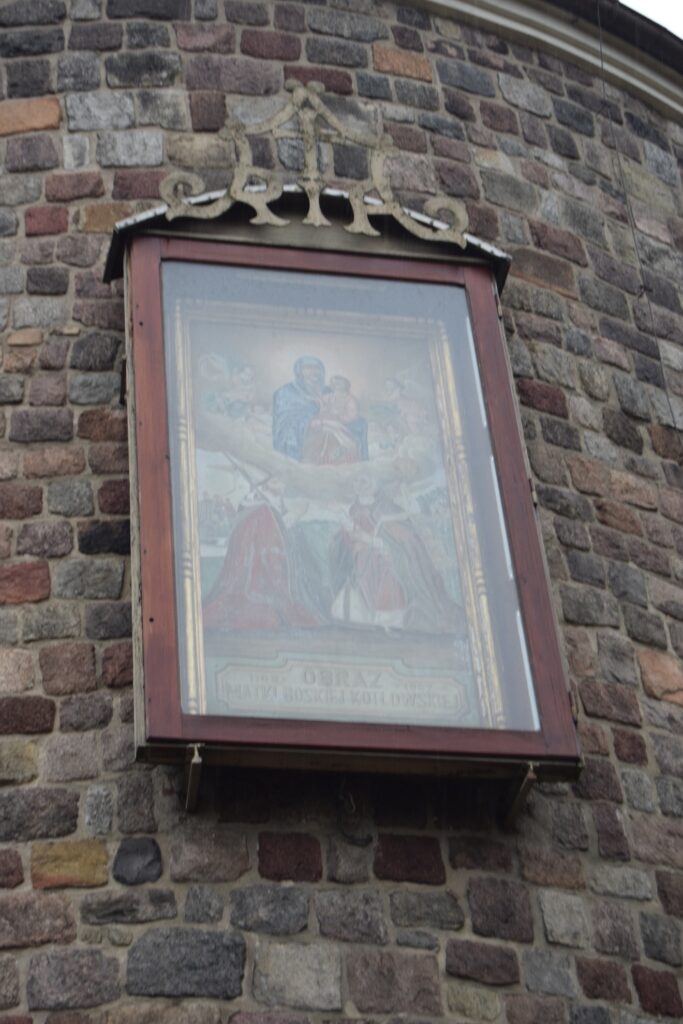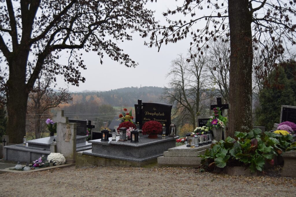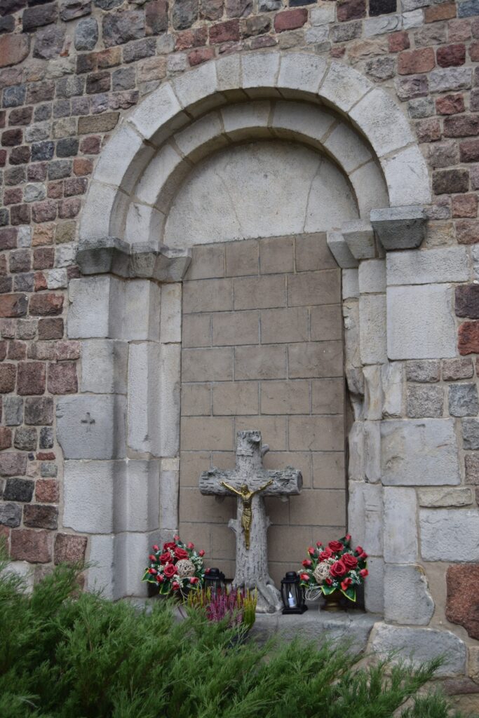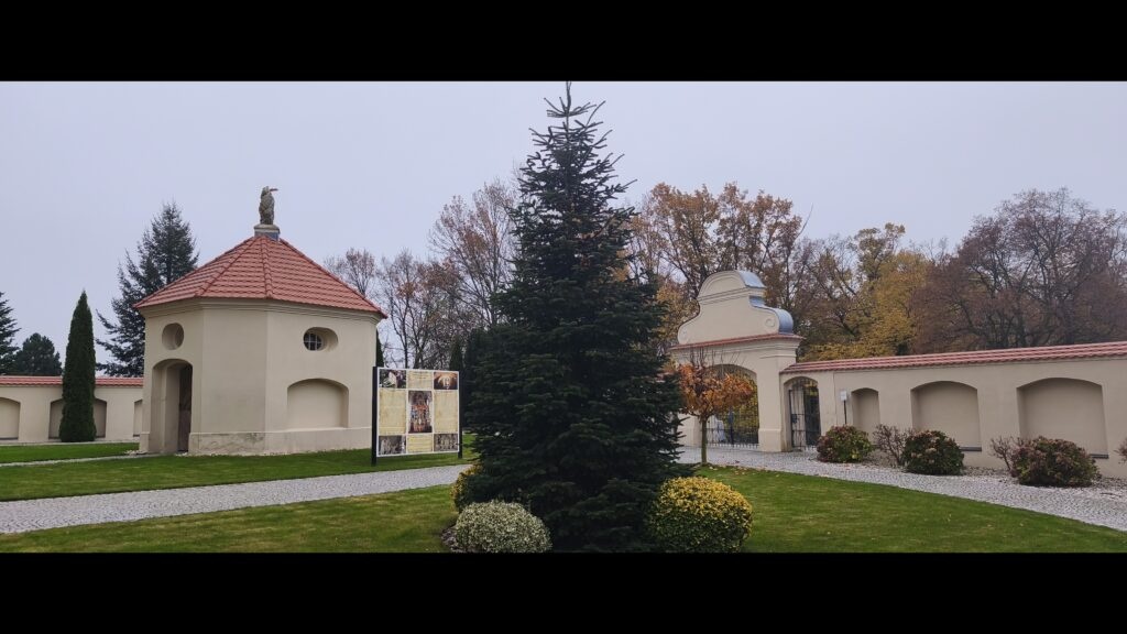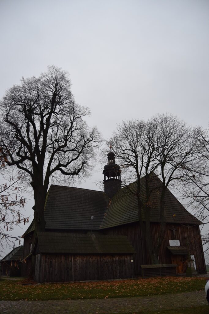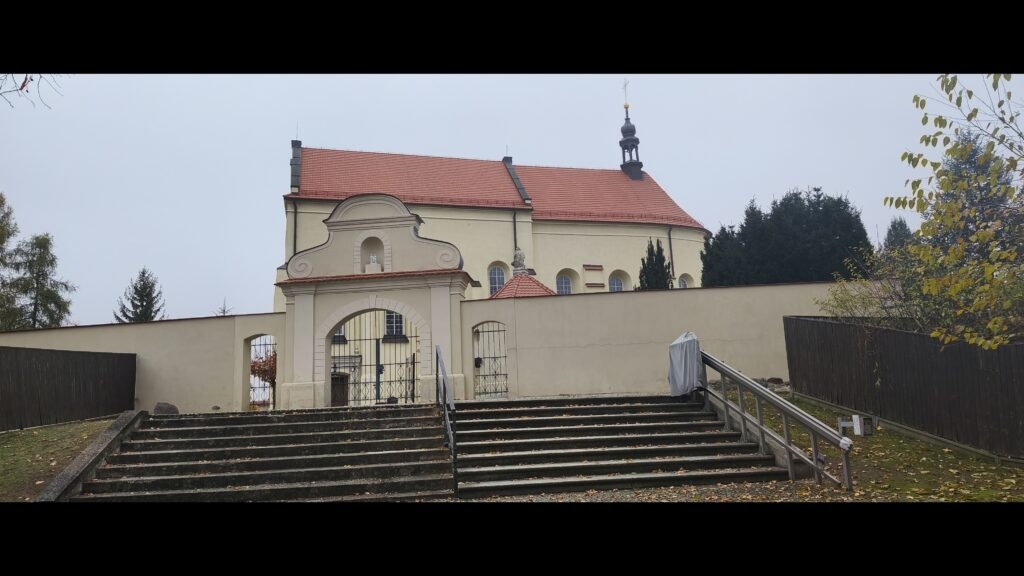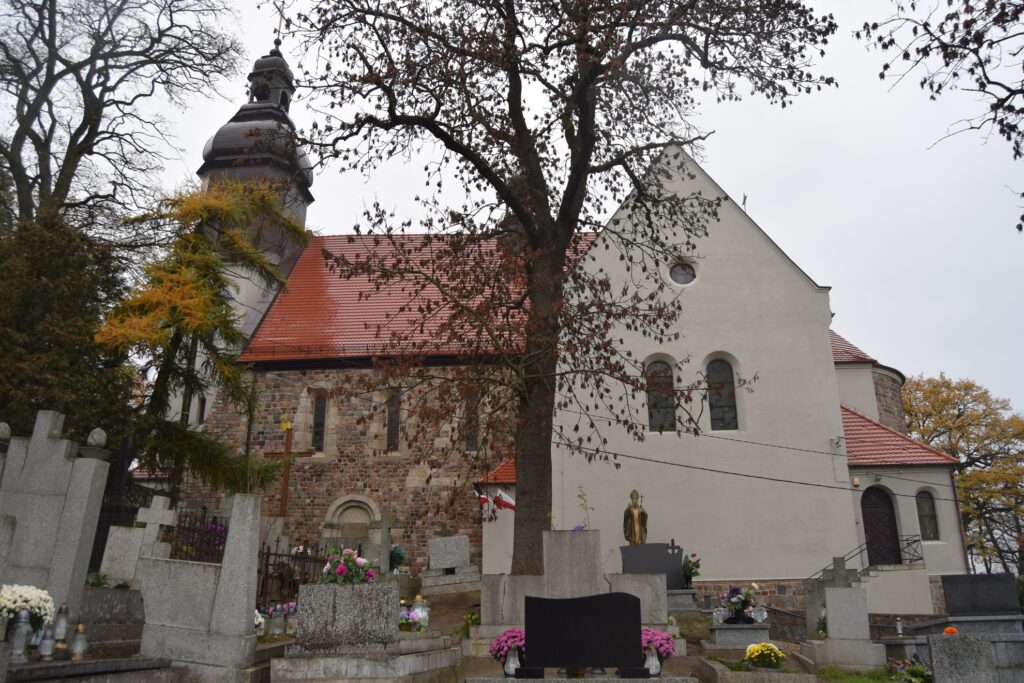 Wschodnia i północna część wzgórza kościelnego oddzielona jest od położonego niżej cmentarza murem oporowym. Tak on jak i ogrodzenie wykonane są z kamienia granitowego i wizualnie współgrają z romańskimi murami świątyni. W skład kompleksu wchodzą jeszcze dwa budynki: Plebania, która bardzo ujęła mnie swoją architekturą oraz dom parafialny. Ta pierwsza to dwa równolegle usytuowane stromodachowe budynki zespolone łącznikiem z wejściem pod drewnianym ganeczkiem. Drugi budynek obsługujący dzisiaj najpewniej grupy pielgrzymkowe, kiedyś pewnie służył nauczaniu religii, a w czasach wilhelmińskich, gdy powstawał, mógł być też katolicką szkołą powszechną. W owych czasach panowała bowiem na tym poziomie nauczania segregacja religijna. Dzięki jesiennemu ogołoceniu drzew z liści widok spod kościoła obejmował dolinę górnej Baryczy i okoliczne Wzgórza Wysockie. Natomiast zamglenia i duża wilgotność powietrza nie pozwalały nam zweryfikować twierdzenia, że kościół w Kotłowie “patrzy” na trzy inne świątynie: w Wysocku Wielkim, Chełmcu i Ołoboku.