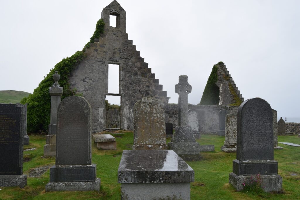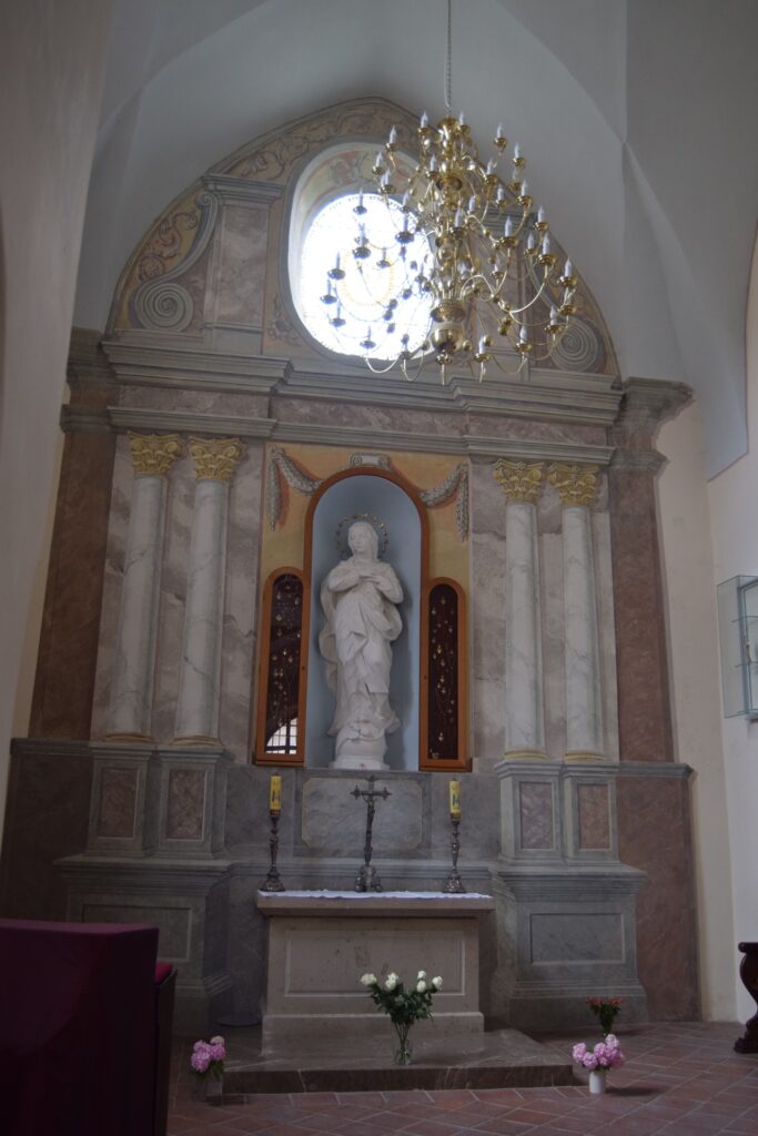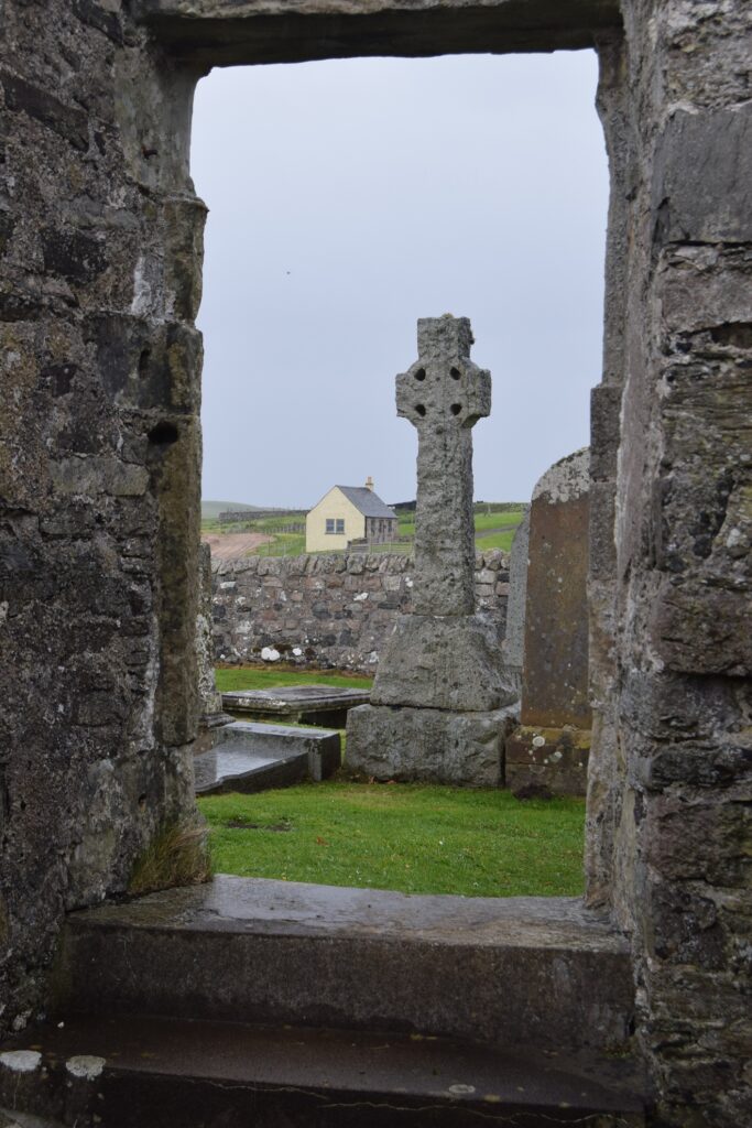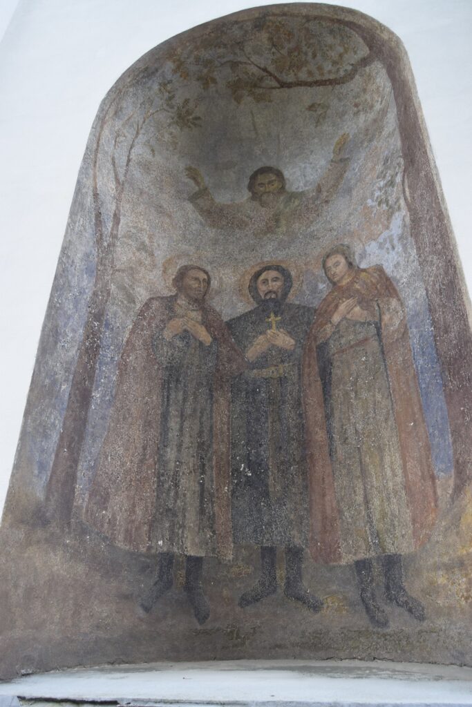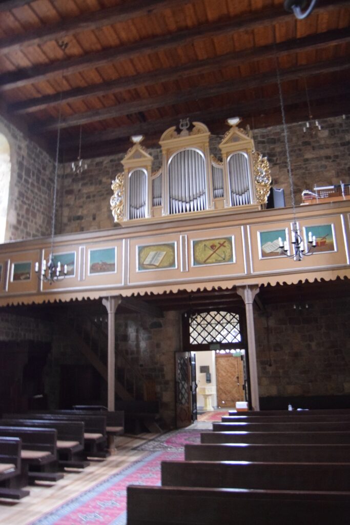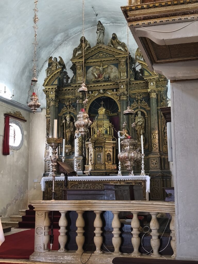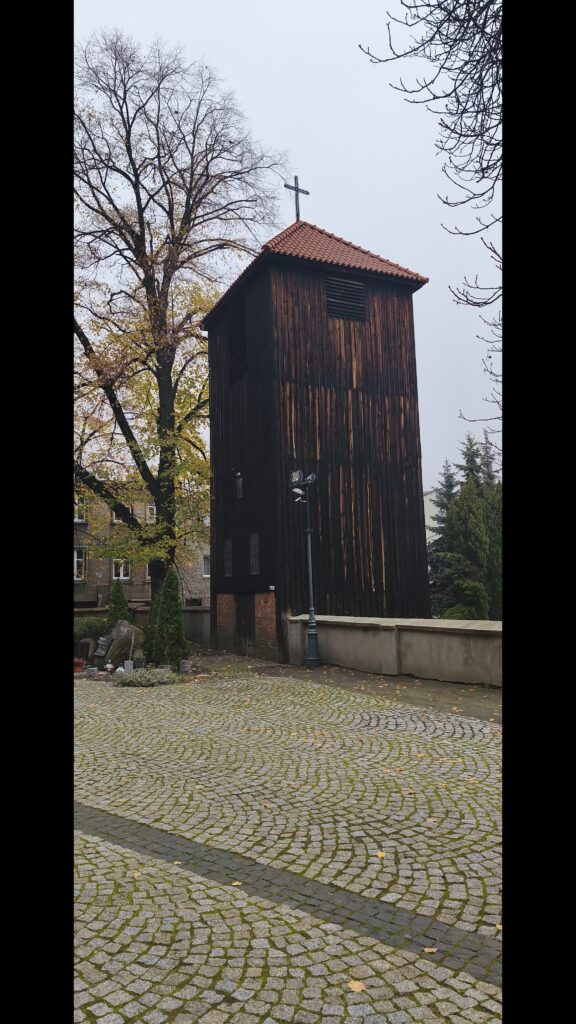 Wschodnia i północna część wzgórza kościelnego oddzielona jest od położonego niżej cmentarza murem oporowym. Tak on jak i ogrodzenie wykonane są z kamienia granitowego i wizualnie współgrają z romańskimi murami świątyni. W skład kompleksu wchodzą jeszcze dwa budynki: Plebania, która bardzo ujęła mnie swoją architekturą oraz dom parafialny. Ta pierwsza to dwa równolegle usytuowane stromodachowe budynki zespolone łącznikiem z wejściem pod drewnianym ganeczkiem. Drugi budynek obsługujący dzisiaj najpewniej grupy pielgrzymkowe, kiedyś pewnie służył nauczaniu religii, a w czasach wilhelmińskich, gdy powstawał, mógł być też katolicką szkołą powszechną. W owych czasach panowała bowiem na tym poziomie nauczania segregacja religijna. Dzięki jesiennemu ogołoceniu drzew z liści widok spod kościoła obejmował dolinę górnej Baryczy i okoliczne Wzgórza Wysockie. Natomiast zamglenia i duża wilgotność powietrza nie pozwalały nam zweryfikować twierdzenia, że kościół w Kotłowie “patrzy” na trzy inne świątynie: w Wysocku Wielkim, Chełmcu i Ołoboku.