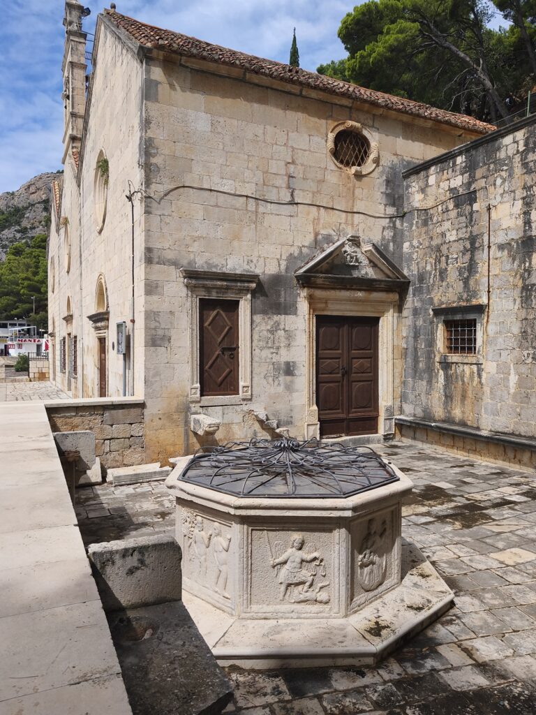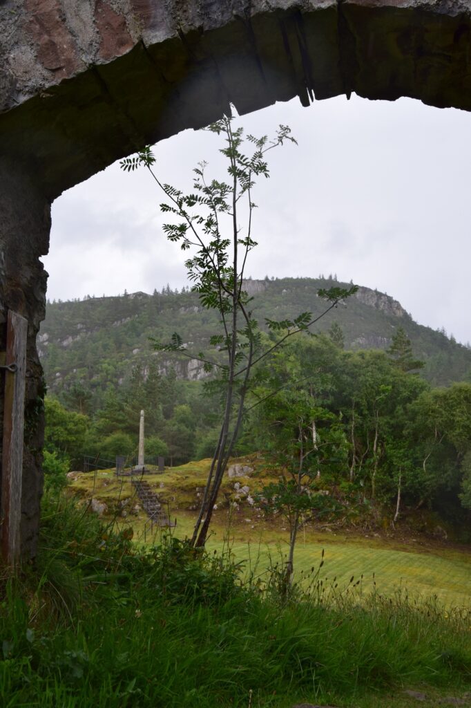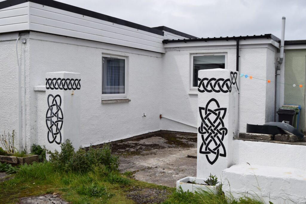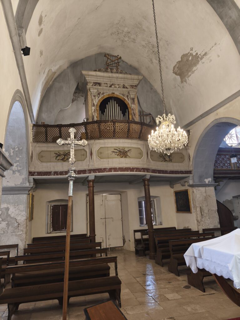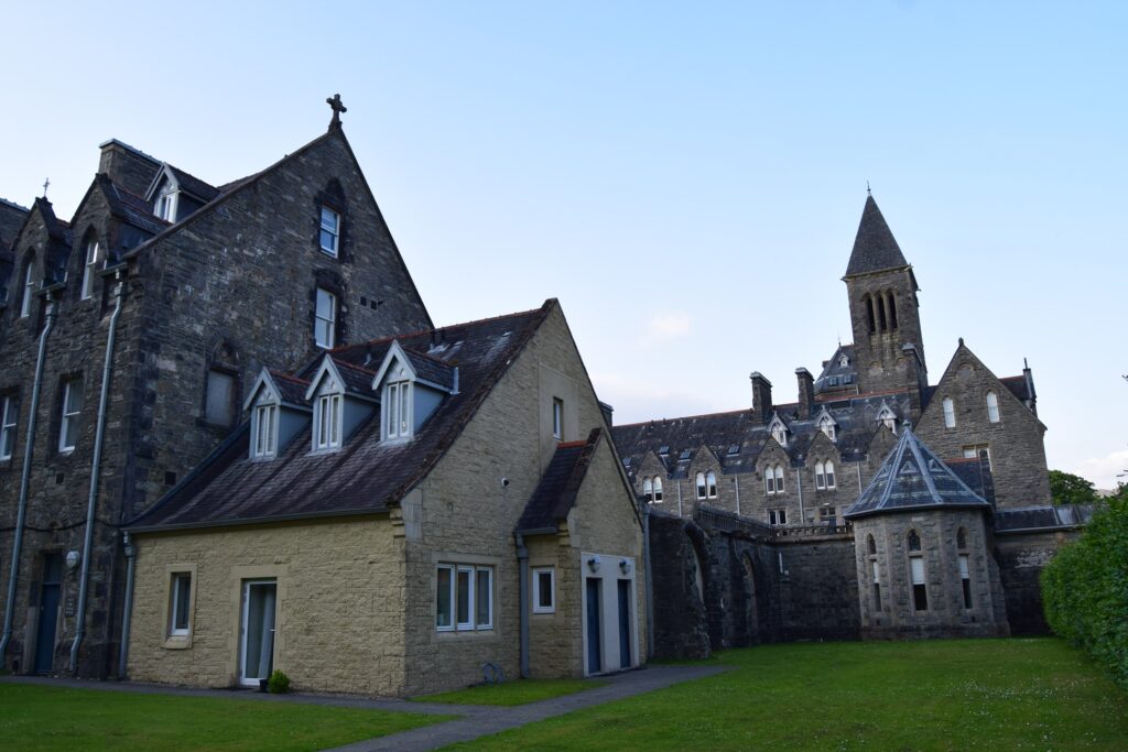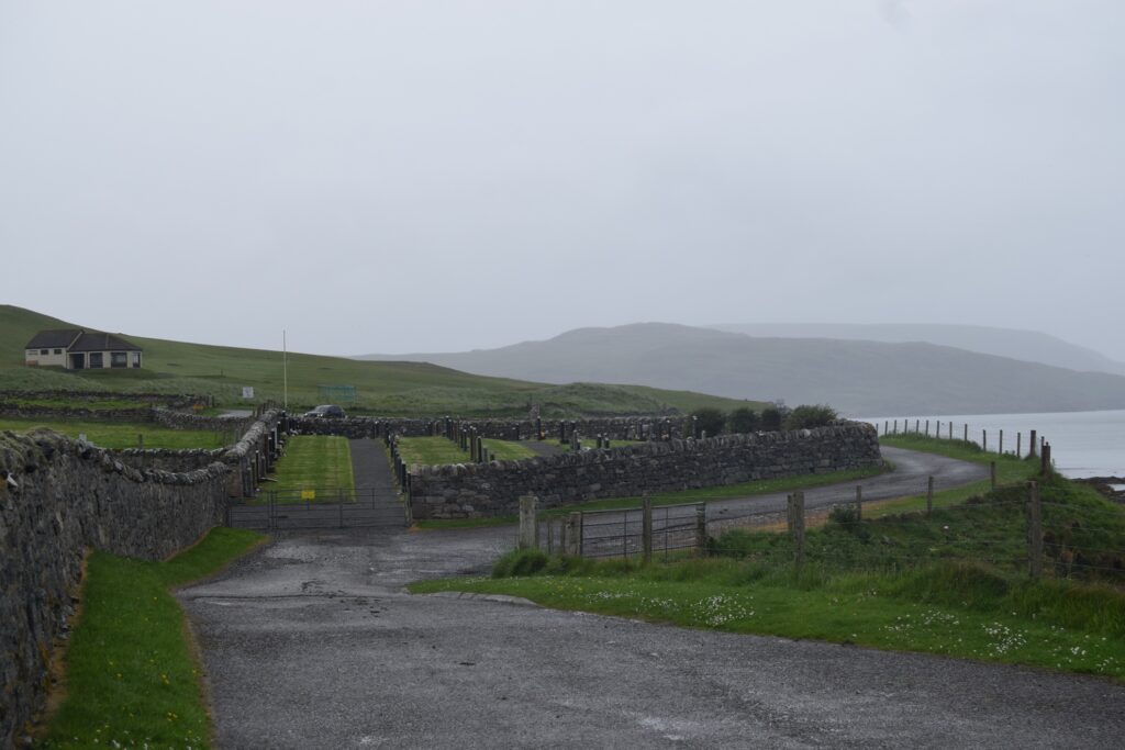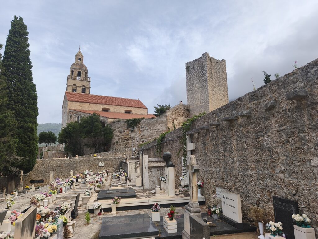 Wschodnia i północna część wzgórza kościelnego oddzielona jest od położonego niżej cmentarza murem oporowym. Tak on jak i ogrodzenie wykonane są z kamienia granitowego i wizualnie współgrają z romańskimi murami świątyni. W skład kompleksu wchodzą jeszcze dwa budynki: Plebania, która bardzo ujęła mnie swoją architekturą oraz dom parafialny. Ta pierwsza to dwa równolegle usytuowane stromodachowe budynki zespolone łącznikiem z wejściem pod drewnianym ganeczkiem. Drugi budynek obsługujący dzisiaj najpewniej grupy pielgrzymkowe, kiedyś pewnie służył nauczaniu religii, a w czasach wilhelmińskich, gdy powstawał, mógł być też katolicką szkołą powszechną. W owych czasach panowała bowiem na tym poziomie nauczania segregacja religijna. Dzięki jesiennemu ogołoceniu drzew z liści widok spod kościoła obejmował dolinę górnej Baryczy i okoliczne Wzgórza Wysockie. Natomiast zamglenia i duża wilgotność powietrza nie pozwalały nam zweryfikować twierdzenia, że kościół w Kotłowie “patrzy” na trzy inne świątynie: w Wysocku Wielkim, Chełmcu i Ołoboku.